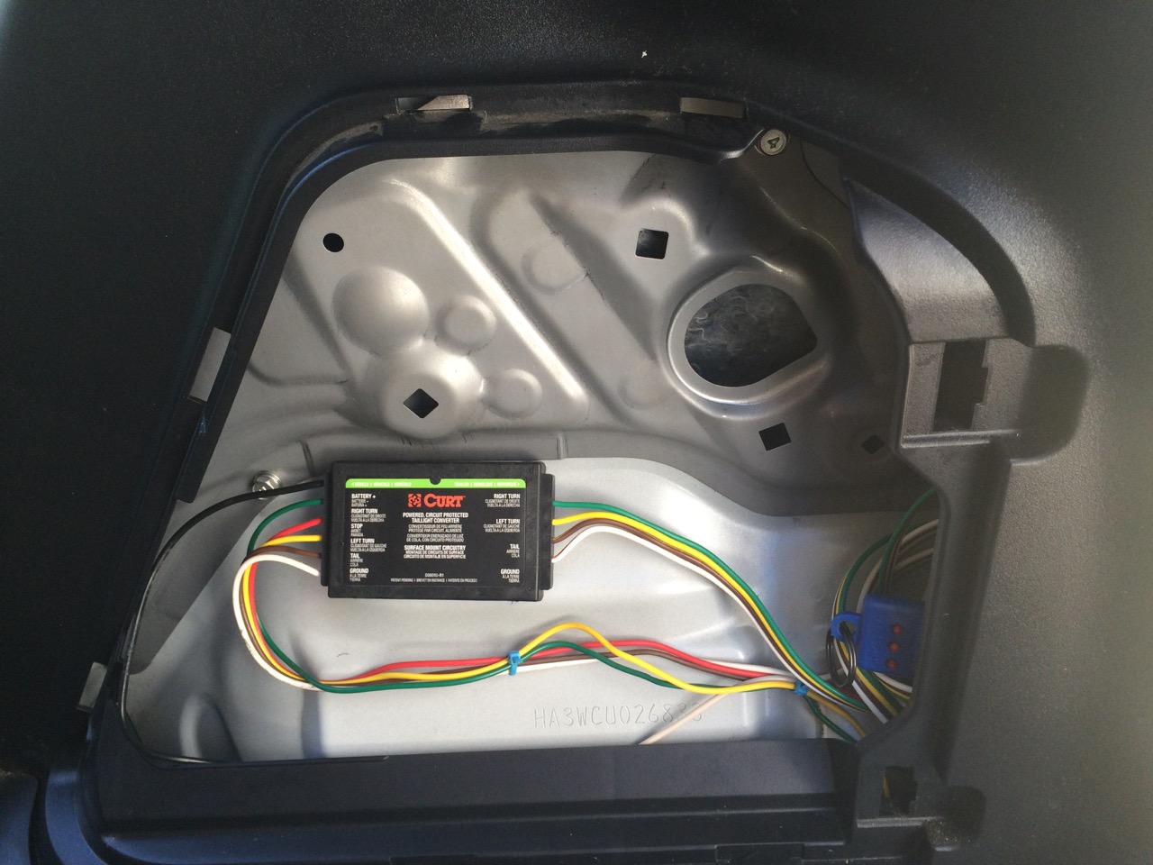 In the rear-right corner of the car, there’s a removable panel, which gives access to the right tail-light connection. It’s also a great spot to place the Curt adapter and to roll up and store the trailer flat-four wiring. While I could access the tail-light connection from there, it was a tight fit, and I quickly realized that I should simply remove the plastic interior body panel.