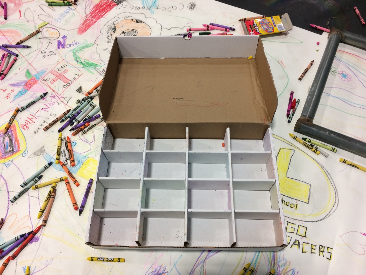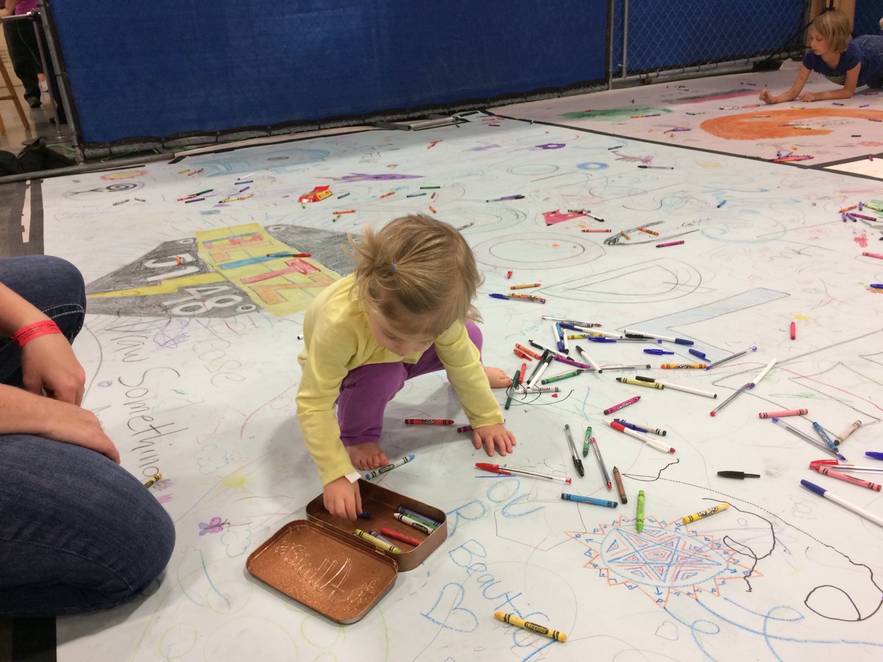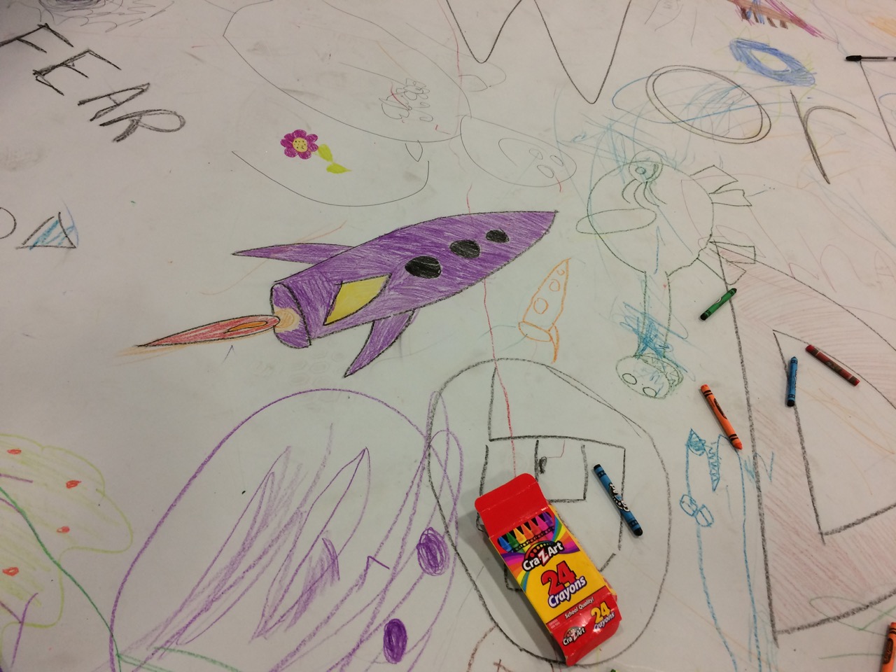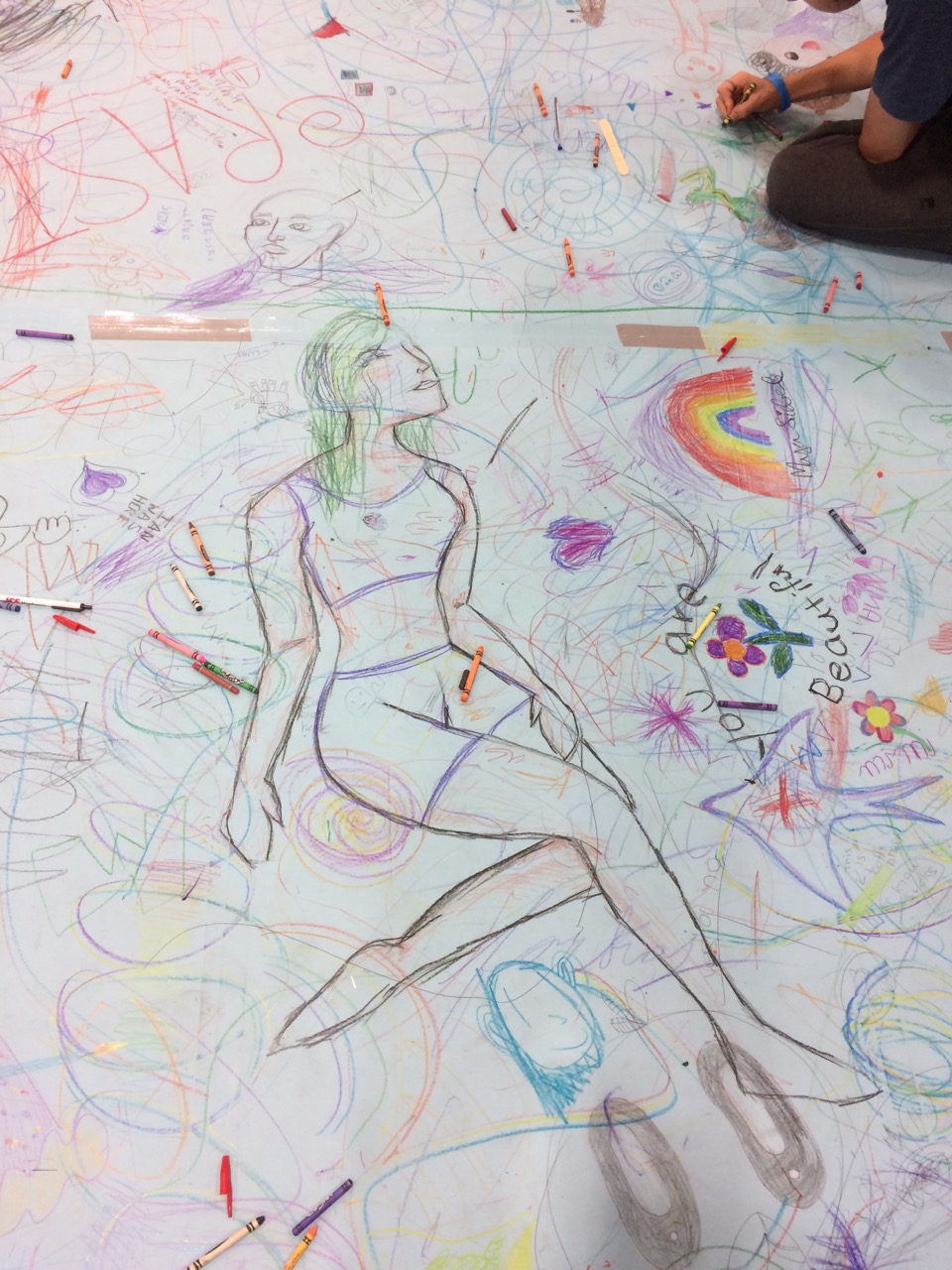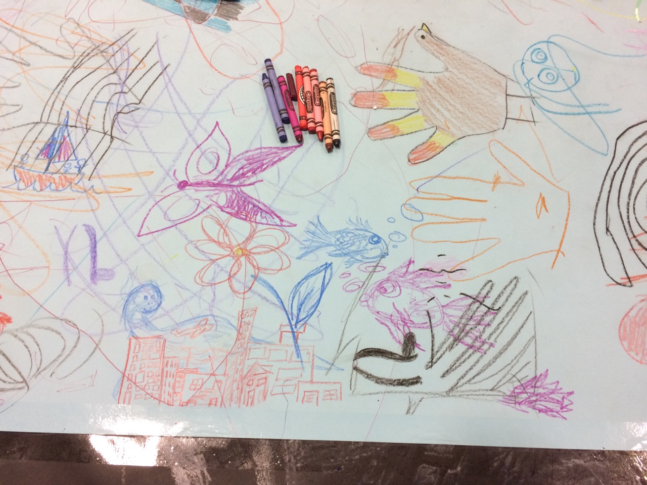 Unfortunately, at the end of day one, not ONE SINGLE CRAYON made it back into a box! Perhaps I SHOULD have given a little more direction… After about an hour of picking up crayons and sweeping, I was able to roll out fresh paper over the top of the first doodle, in preparation for Sunday.