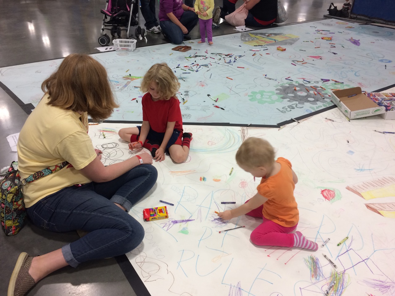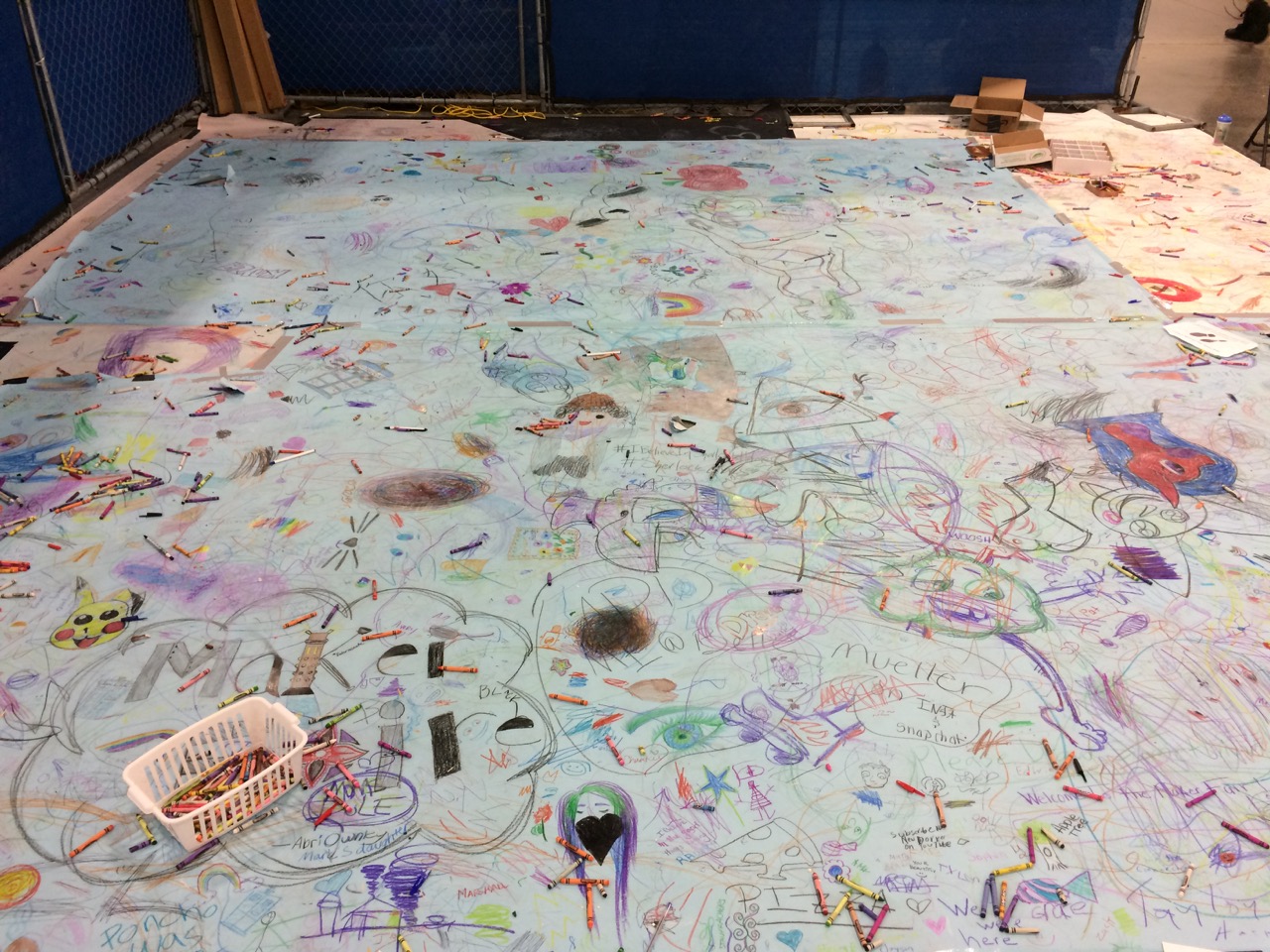 The paper is 9 feet wide. So, I made sort of a patchwork of paper to fit the 20′ x 20′ exhibit space. Next, I put out over 800 crayons.