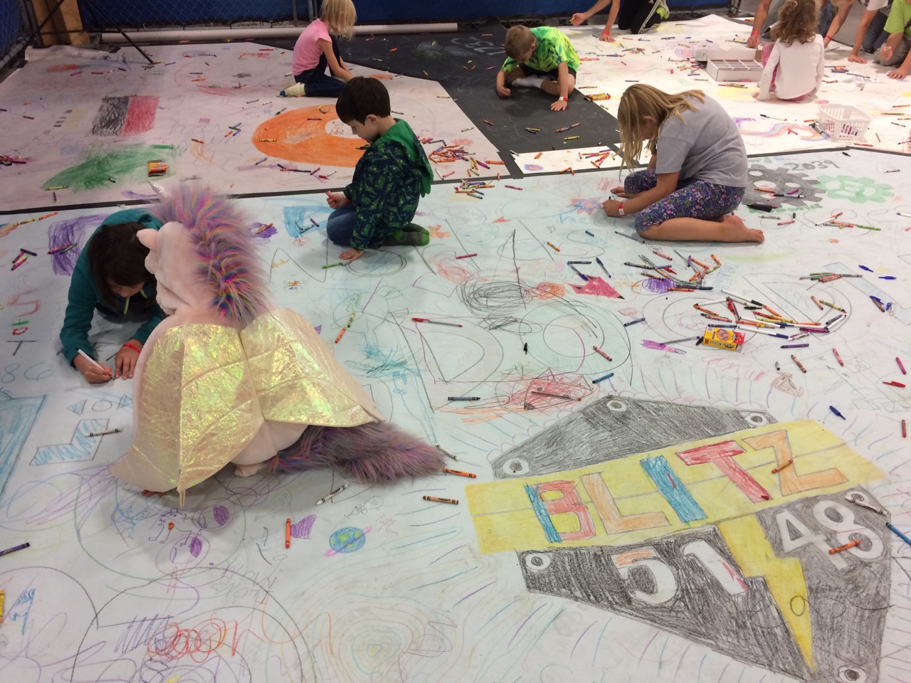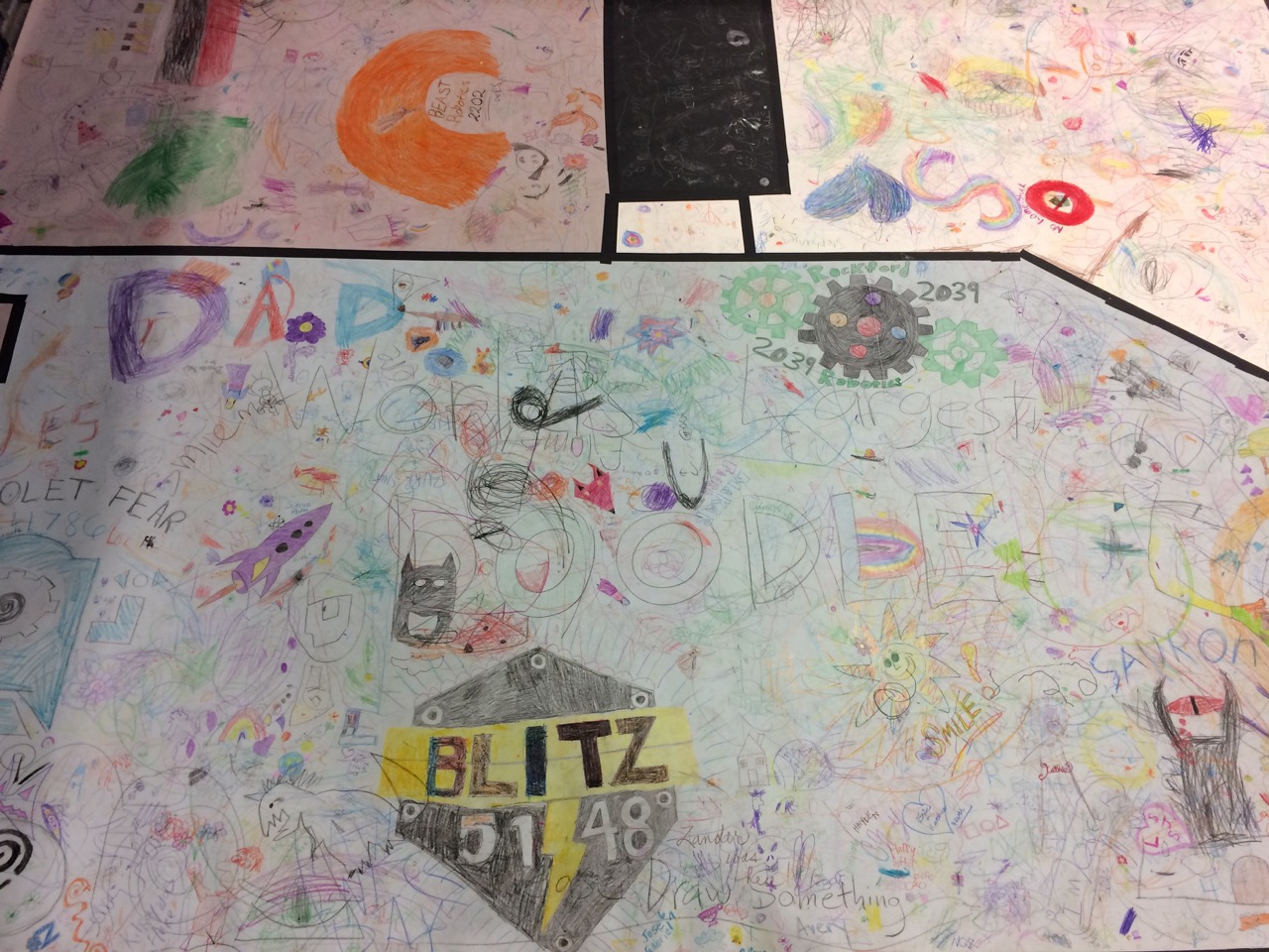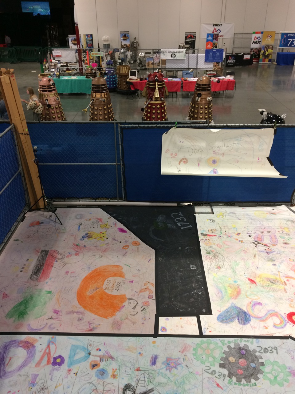 The paper looked nice and full far before the end of the day. People crammed doodles in all available space. There were quite a few scribbles, but I think that’s because there was a rather large amount of very young children. Parents appreciated just being able to set down their toddlers to let them play freely for a while. The First Robotics students also used the space as a way to promote their own teams by drawing up their logos. Overall, there were robots, unicorns, video game characters, and other recognizable characters from pop culture, along with simple shapes and objects like an eye or a fish.