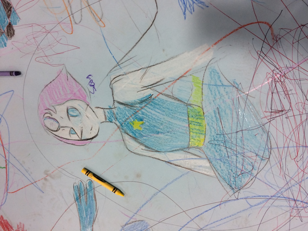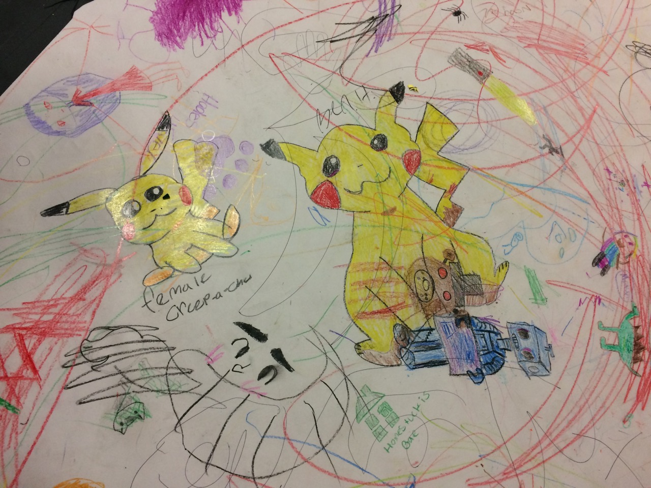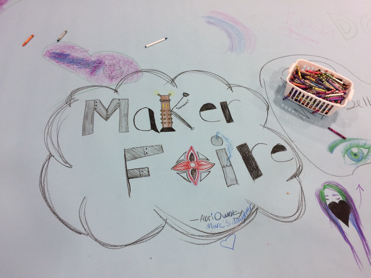 The paper looked nice and full far before the end of the day. People crammed doodles in all available space. There were quite a few scribbles, but I think that’s because there was a rather large amount of very young children. Parents appreciated just being able to set down their toddlers to let them play freely for a while. The First Robotics students also used the space as a way to promote their own teams by drawing up their logos. Overall, there were robots, unicorns, video game characters, and other recognizable characters from pop culture, along with simple shapes and objects like an eye or a fish.