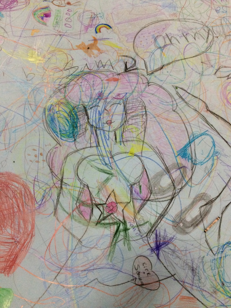 There were no directions for the kids, other than “Please Draw Something” and “Have Fun”. I didn’t put out any signs saying “Make sure to share” or even “Don’t write any naughty words!” Nope. No direction like that*. I figured it would be interesting to see what happened. What would they draw? Would kids write dirty words everywhere? Would there be political commentary? I looked forward to finding out.