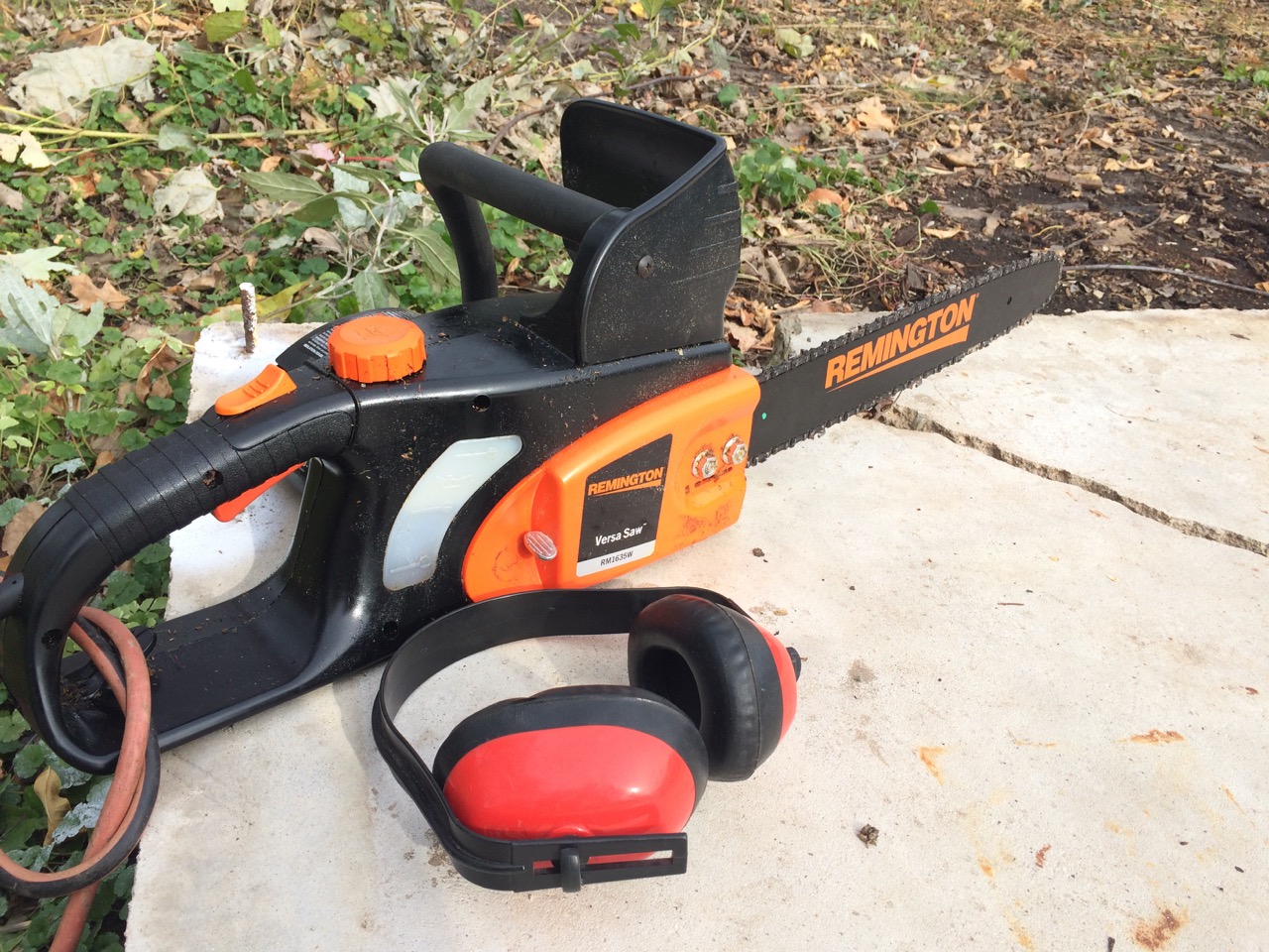 Today, I was by myself. I grabbed my trusty electric corded chain-saw from the shed. Using an extension cord would be a limitation if I was off in the woods, but for work in a back-yard, it’s great. No carburetors, no pull-starts, no gas/oil mixture, just pull the trigger and start cutting. I also like it from a safety point of view. With the electric, the blade starts and stops quicker and since the saw is quieter (plus no idling,) I can hear things like the tree creaking, a sign that it’s ready to give way.