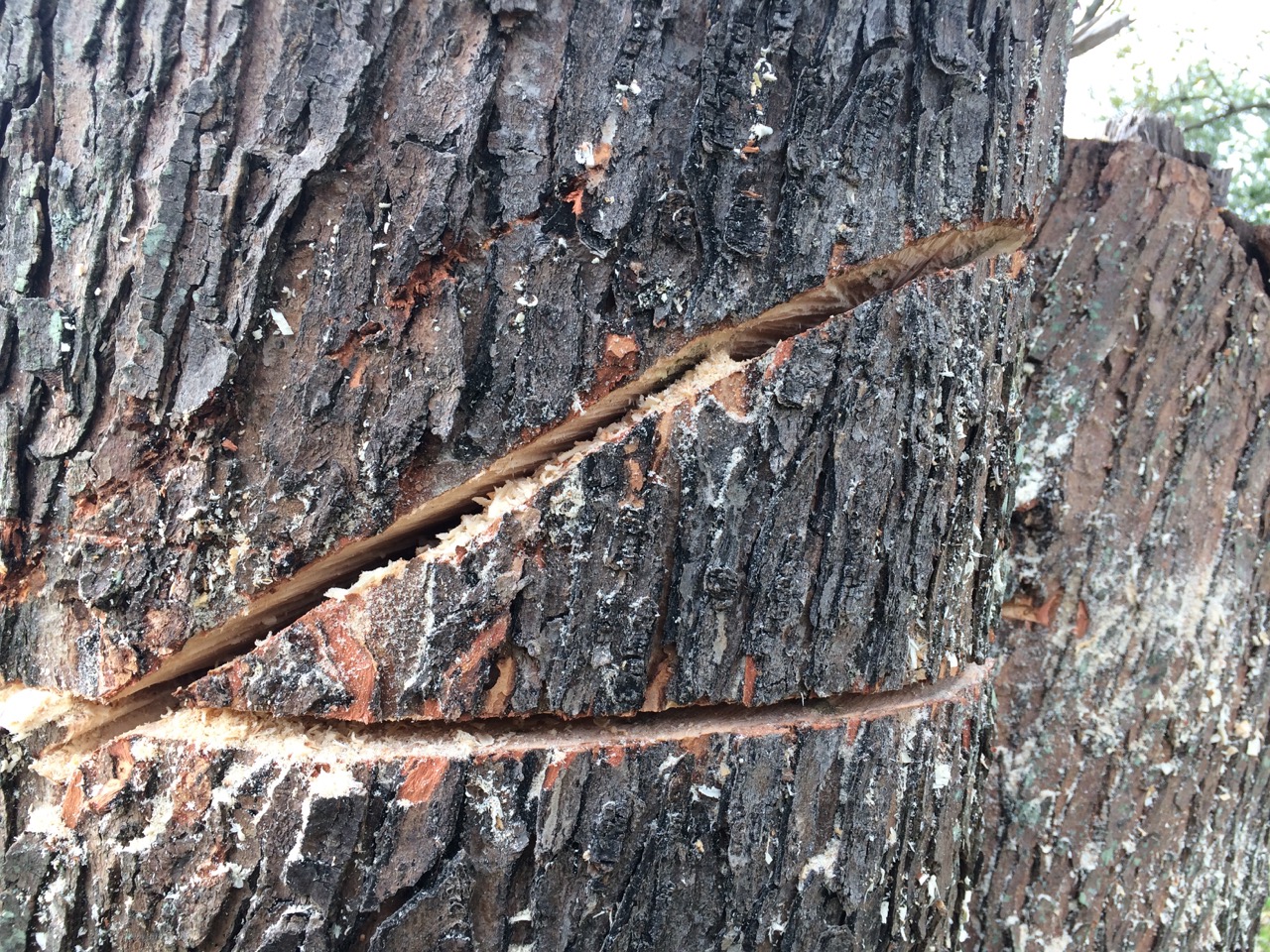 I cut the “bird’s mouth” wedge-shaped cut on the down-hill side of the tree. Unfortunately, the other half of the trunk limited where exactly I could fit the blade. Once that was done, I rolled the camera and proceeded with the cut on the back of the tree. I wasn’t able to make a great cut even with the front side, so that meant I ended up having to cut a little more from the front. THAT lead me to getting the say blade pinched in the tree. Oh well. I was already at the point of adding wedges to the back to push the tree over. So, not my finest cutting, but this was a smaller section of tree, and there was plenty of room for it to fall.