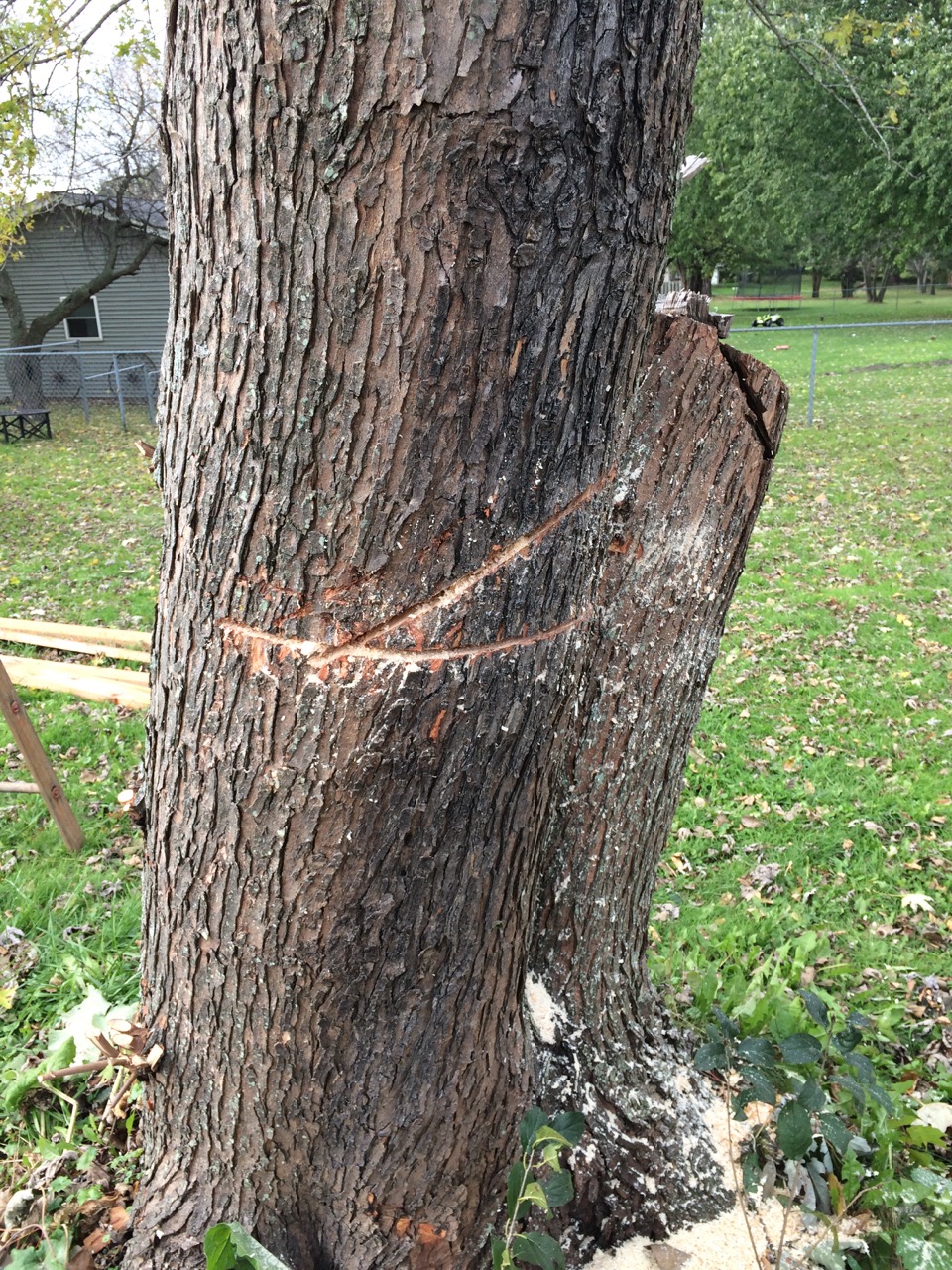 This ugly old twin-trunked junky maple is right at where the back corner of the new garage will be. To dig the new foundation, this tree has to go. We decided that the best route would be to use some professional help for the trunk and the roots, but that also meant getting the tree MOST of the way to the ground. The idea was to leave enough for leverage for a “Bobcat” or similar power machinery to grab the trunk and get some roots to come out with it.