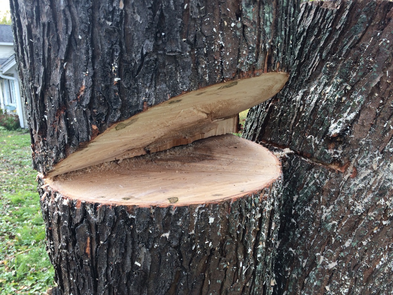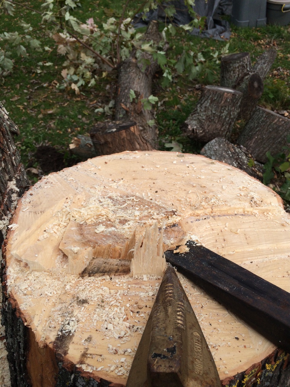 I’d already cut down most of the tree earlier this summer. That was an adventure in itself, as the maple had long spindly branches, including one over the garage, and another that reaches the neighbor’s fence. Earlier, we took down the large pine tree. That was a bit of trigonometry, but we laid the tree down with the tip of the tree within ONE FOOT of where I was aiming. I couldn’t believe it. Not bad for just a tape measure, speed square and level to do the calculations.