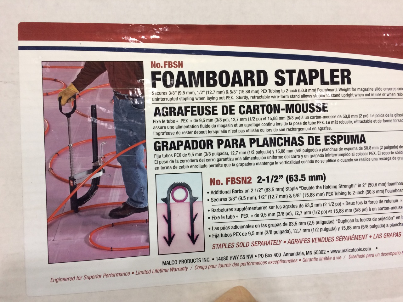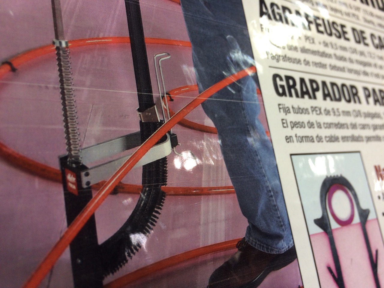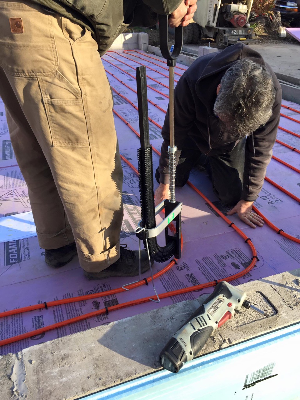 Saturday morning, Wayne (my brother and general contractor) got started early. I set up a plastic box for the tubing to run through centered on the west wall. The design was using 10″ spacing, so we snapped chalk-lines 10 inches apart to evenly staple the tubing down to the 2″ rigid extruded polystyrene insulation. When I was at the store, I also rented a stapler. Pushing down on the large D-ring handle inserts a plastic staple over the tubing and down into the foam. The plastic staples are considerably less expensive than the plastic clips that would be manually screwed down into the insulation. However, the stapler itself cost $250! Yipes!Fortunately, the store RENTED the exact same stapler.