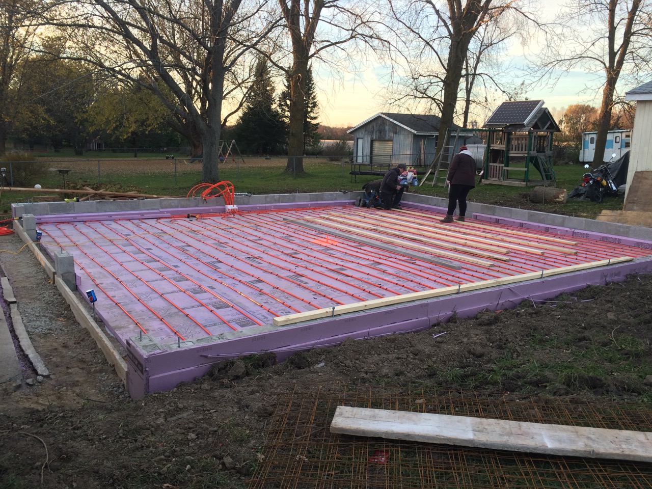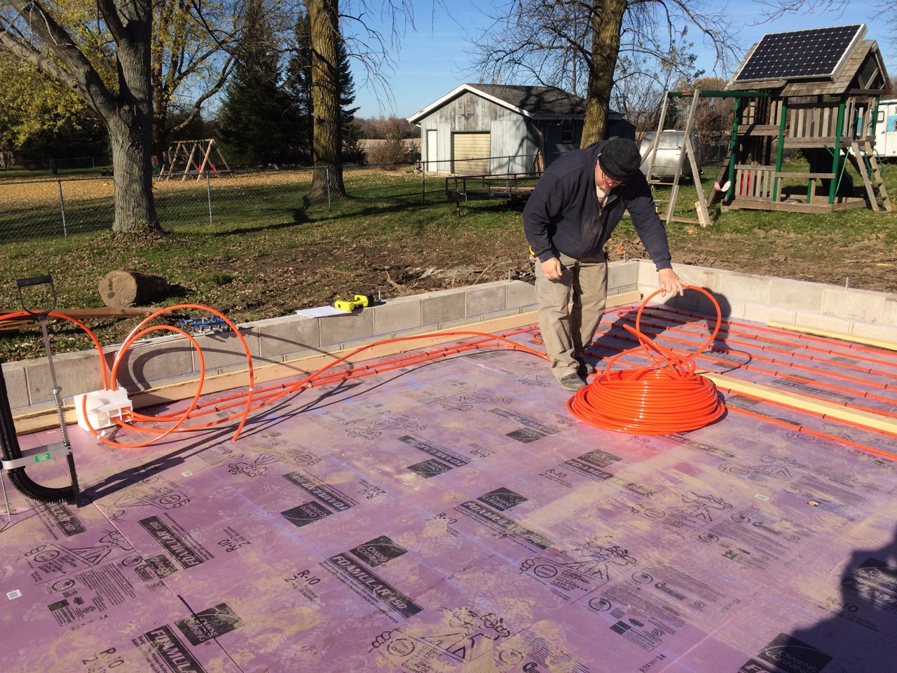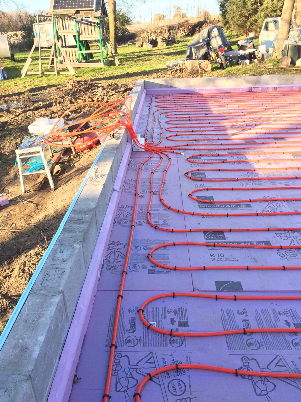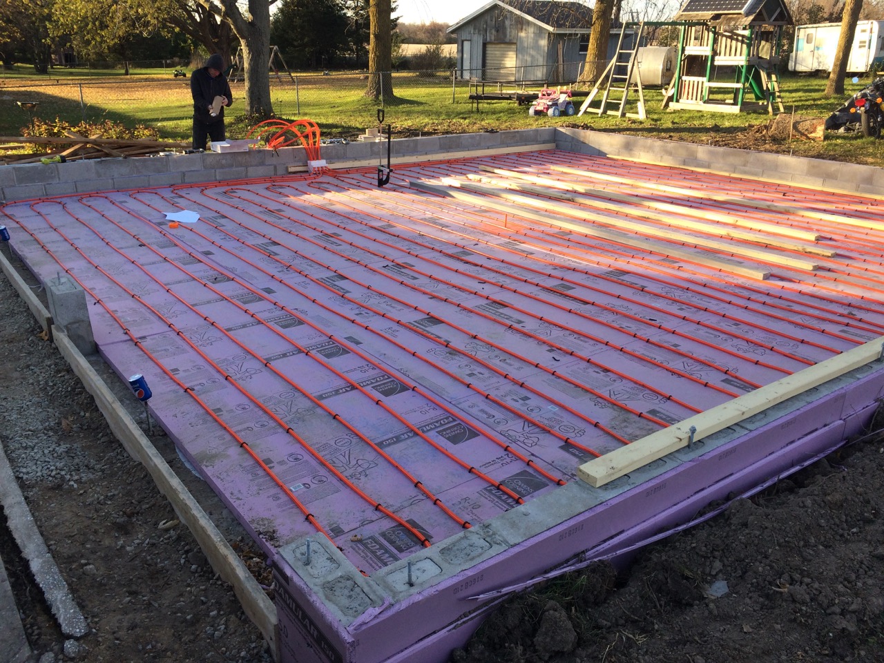 This was all right about lunch time, and Wayne had to take off for some other things he needed to get done. I headed off to the store. I also planned to pick up some more 2″ foam for perimeter insulation to go around the concrete to thermally break it from the stem walls. My Dad would be helping out in the afternoon. Also, Monica, the wife of my work friend, Kurt, wanted to come on out to lend a hand and learn about hydronic heat.