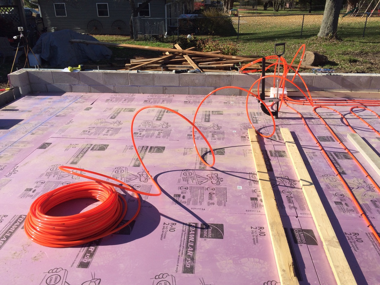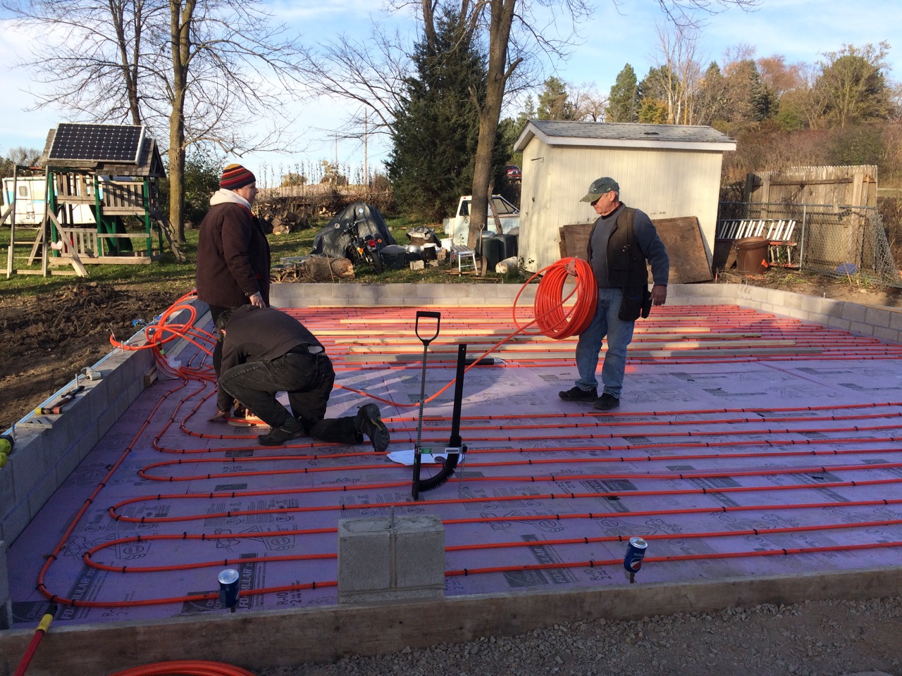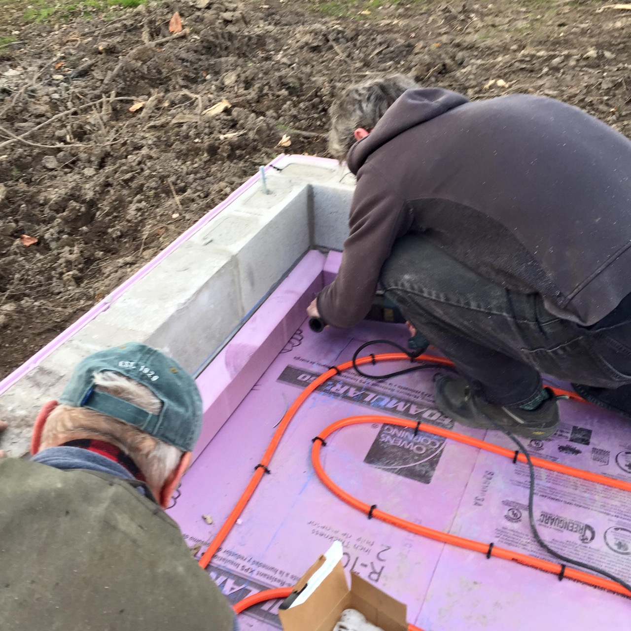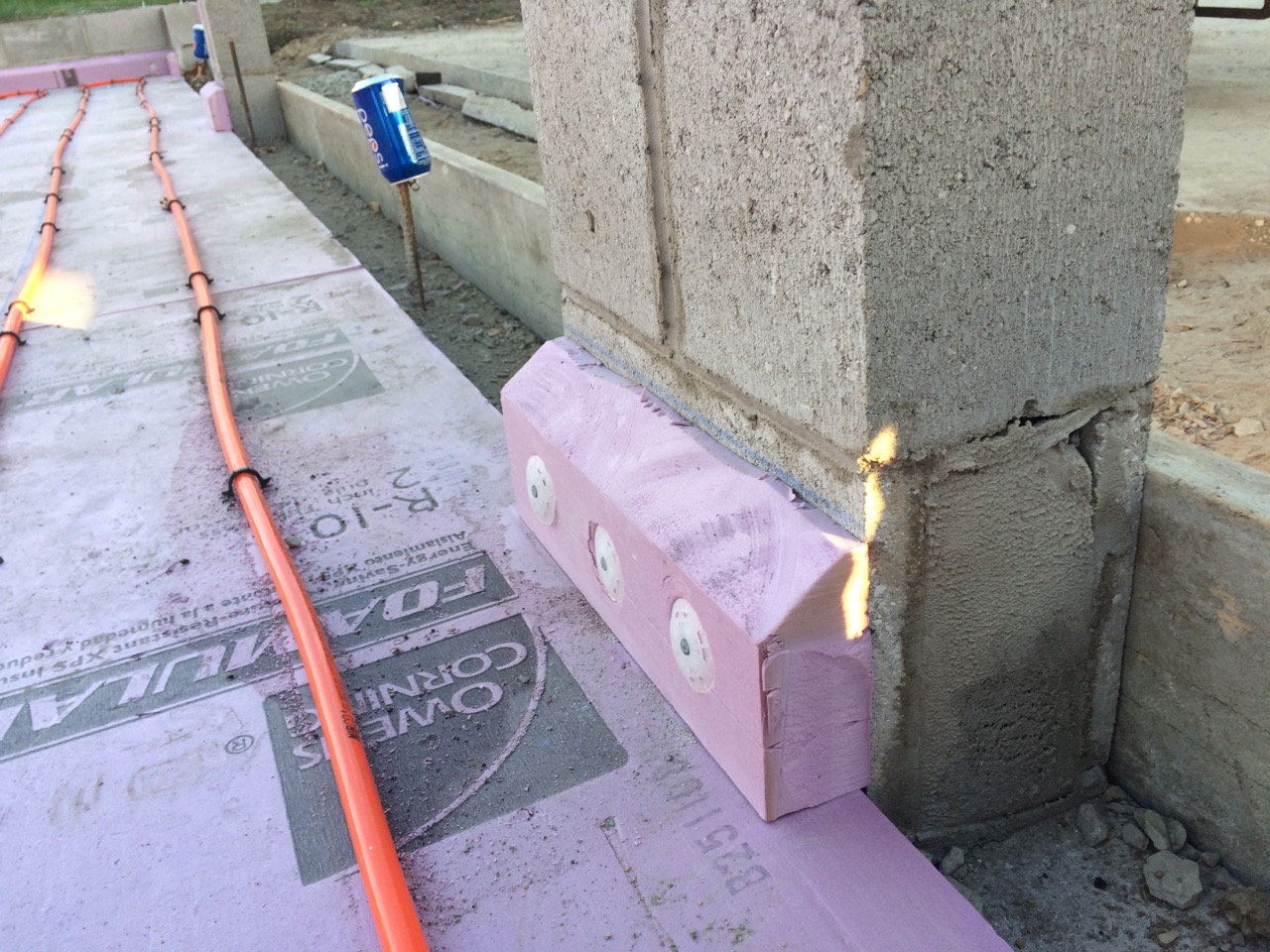 This was all right about lunch time, and Wayne had to take off for some other things he needed to get done. I headed off to the store. I also planned to pick up some more 2″ foam for perimeter insulation to go around the concrete to thermally break it from the stem walls. My Dad would be helping out in the afternoon. Also, Monica, the wife of my work friend, Kurt, wanted to come on out to lend a hand and learn about hydronic heat.