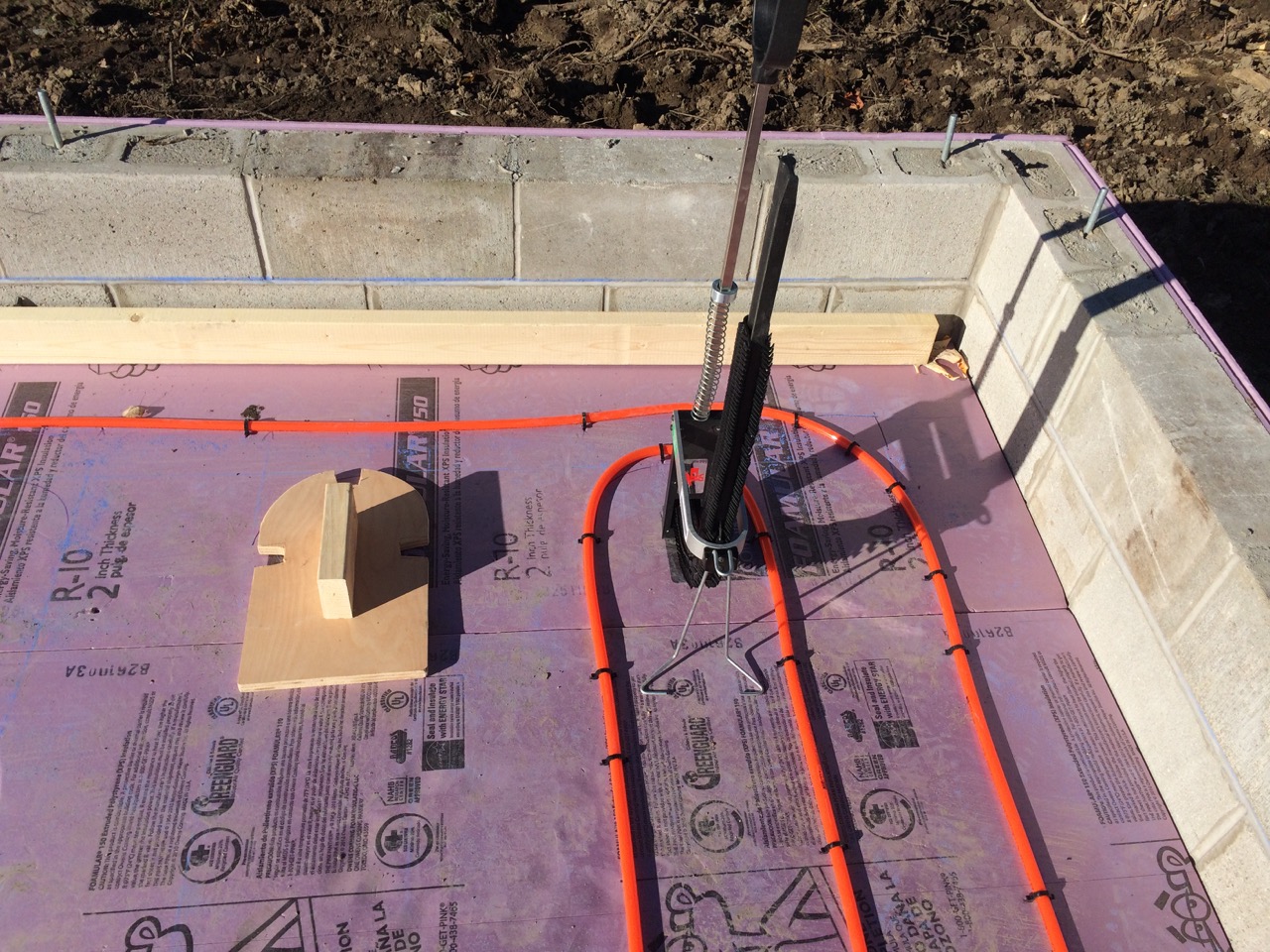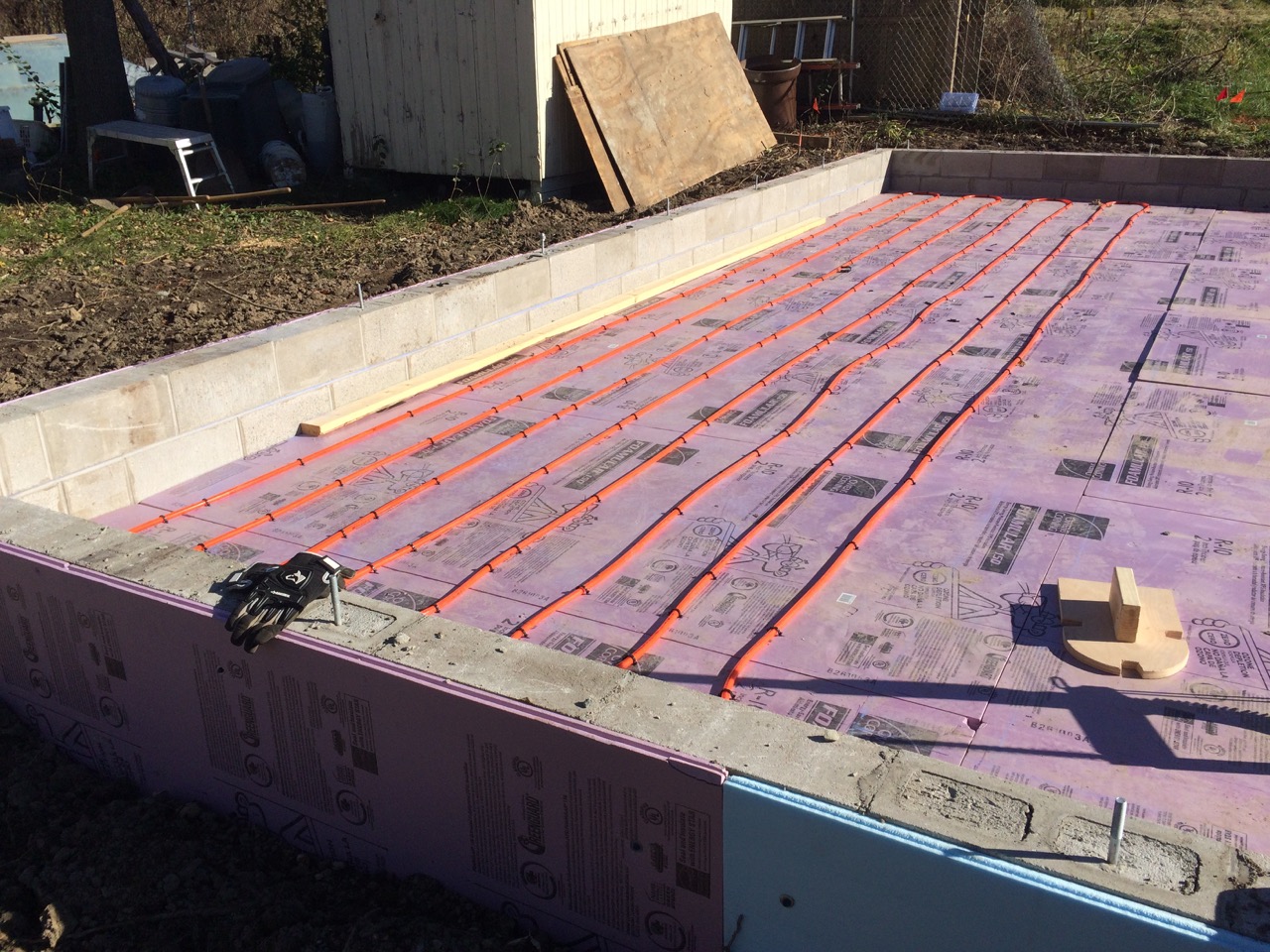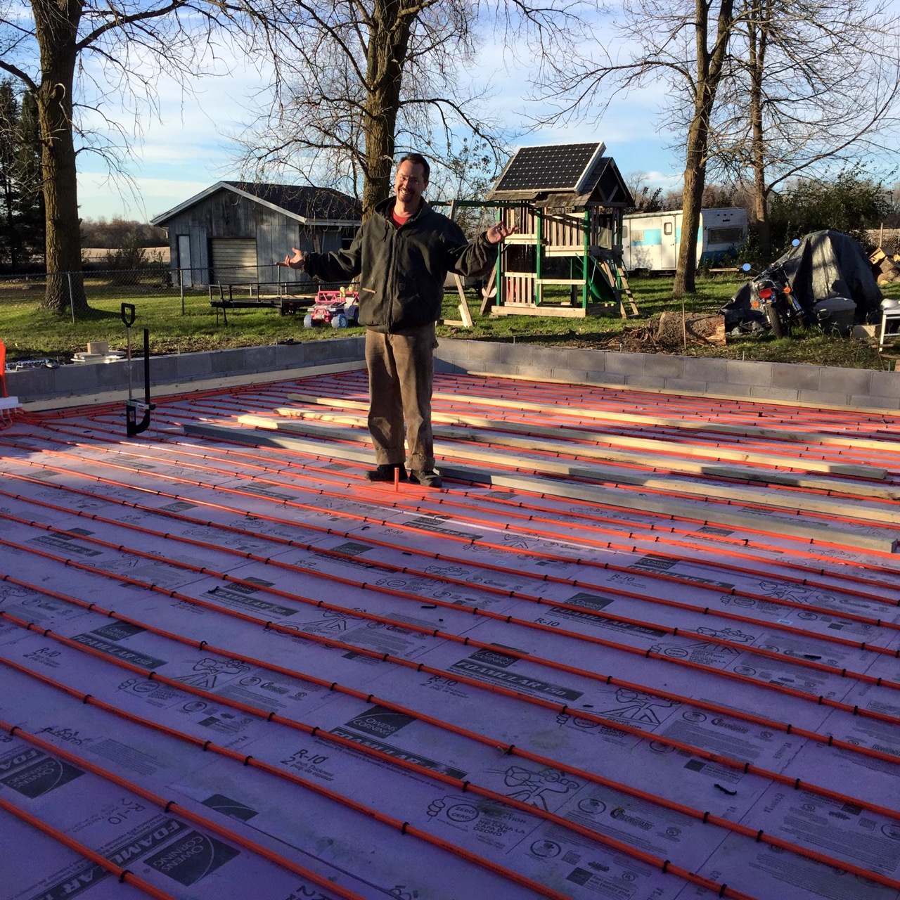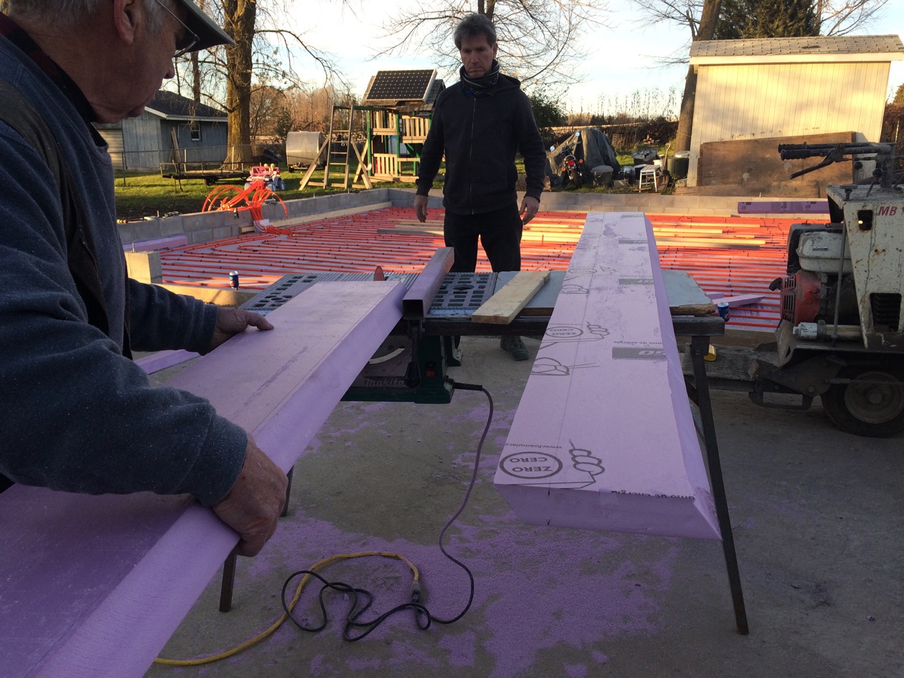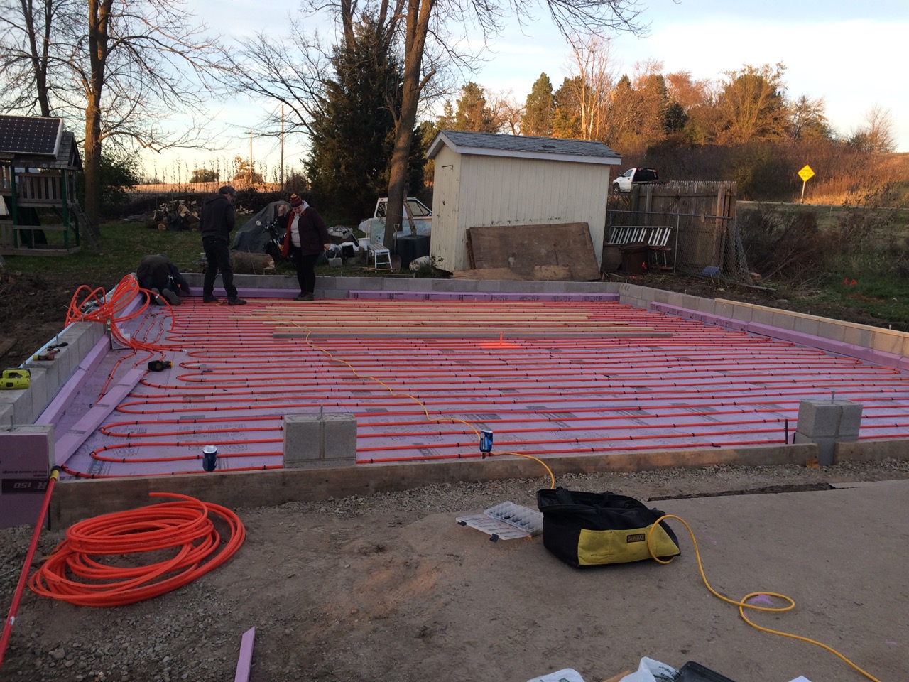 This was all right about lunch time, and Wayne had to take off for some other things he needed to get done. I headed off to the store. I also planned to pick up some more 2″ foam for perimeter insulation to go around the concrete to thermally break it from the stem walls. My Dad would be helping out in the afternoon. Also, Monica, the wife of my work friend, Kurt, wanted to come on out to lend a hand and learn about hydronic heat.