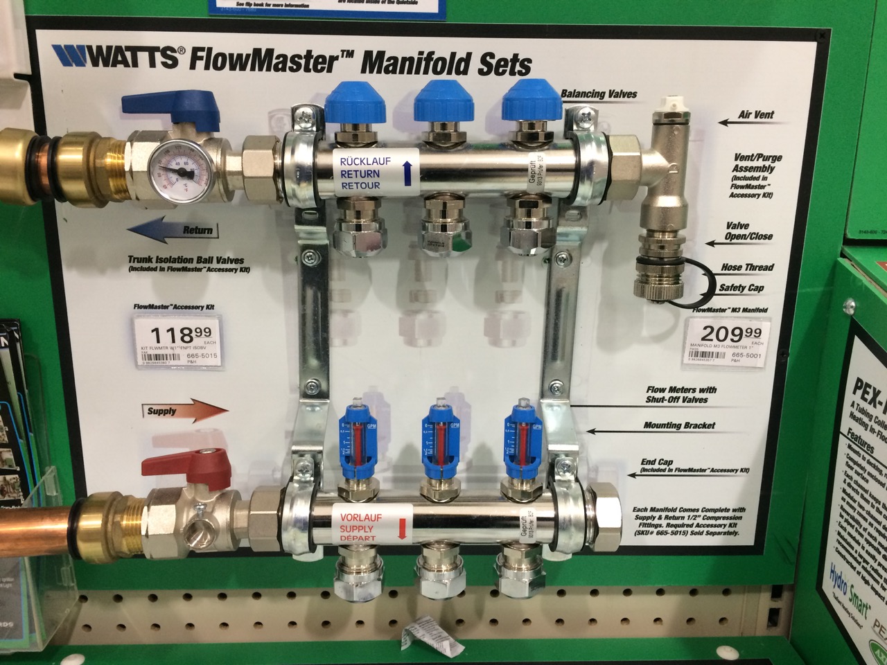 I also purchased a Watts brand four circuit manifold. It was more expensive than a plain copper manifold (such as would be used for something like just domestic water) but was of higher quality, and had some nice features, such as including built-in flow-meters and temperature gauges. I’d also want to have the manifold handy so that I could pressure test the system BEFORE the concrete was poured. Heaven forbid that there would be a hole in the Pex tubing, but I would want to know that BEFORE it was permanently cast in concrete.
