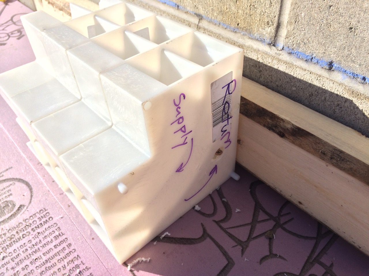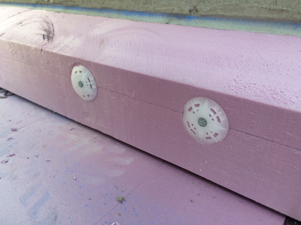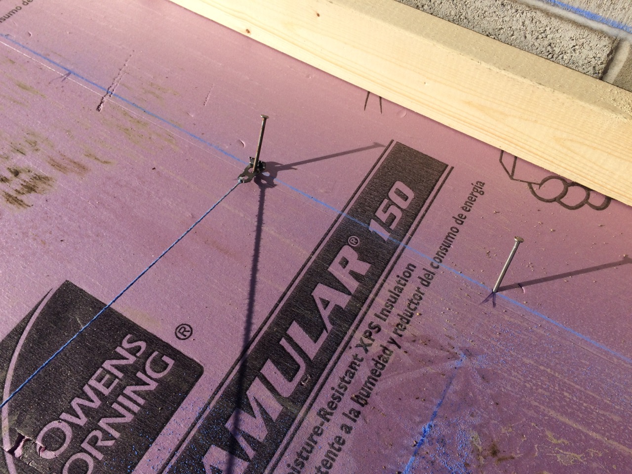 My father had is table-saw handy and made quick work of ripping 5″ cuts of angled foam. I had accidentally purchased the wrong length of concrete screws, so we instead used some lengths of aluminum wire to pin the insulation in hammer-drilled holes in the concrete wall. We really only needed to keep the foam from blowing away during the weekend and moving when the concrete was actually poured.