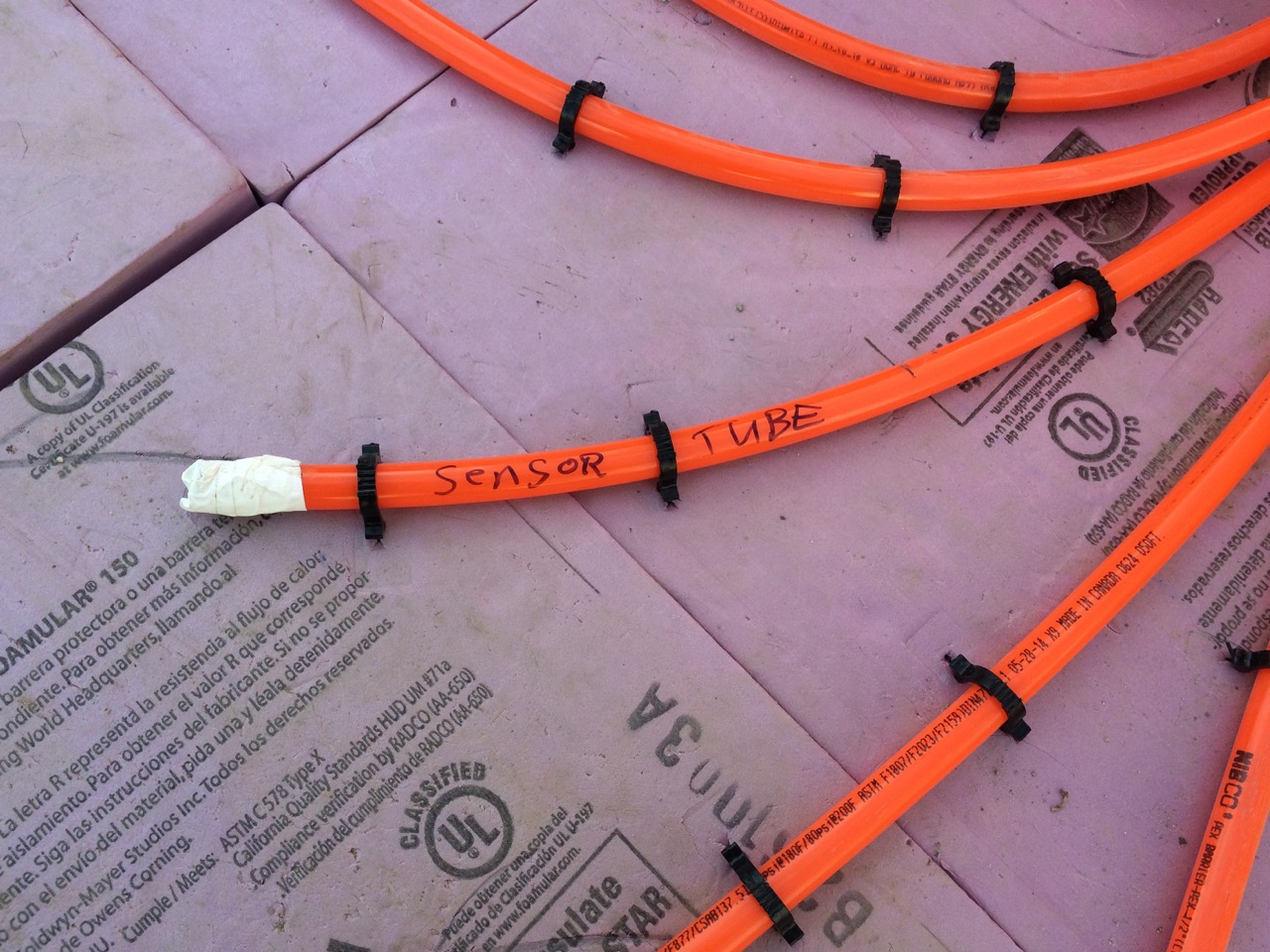 I showed the new afternoon crew how we were laying down the tubing. It was even easier having extra people power. Three of the tubing circuits were already laid out, so we only had to do the final one in the afternoon. I also installed a piece of tube about two feet long for a future temperature probe. I simply duct taped the end that would be in the concrete and left of foot or two above ground level. I also made sure to center the tube between a supply and return tube so that the the sensor should pick up the average temperature of the floor.