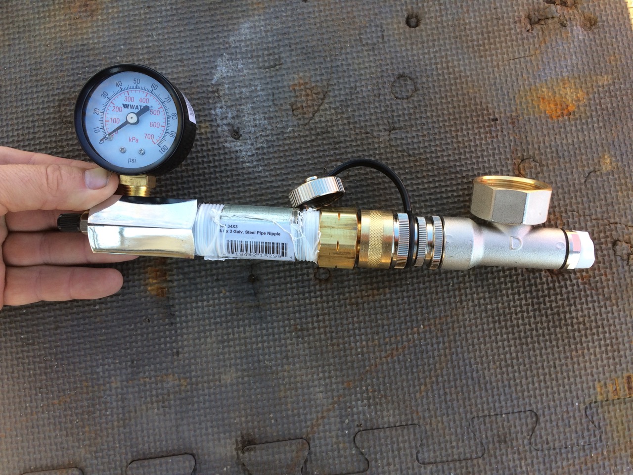 Next, I threaded a 100 PSI air pressure gauge onto the manifold. It included a a valve similar to a tire stem for me to connect my air compressor and fill the tubing with compressed air. I initially connected it to a garden-hose style connector built onto the manifold which is designed for filling. However, I couldn’t seem to get a good seal there and the built-in valve on the filler was awkward to work with. Instead, I went to the hardware store to get a 1″ to 3/4″ adapter and then connected the air gauge to one of the main connections of the manifold. That also had a nice easy to use ball valve right where I wanted it. Finally, I could put air in the tubing.