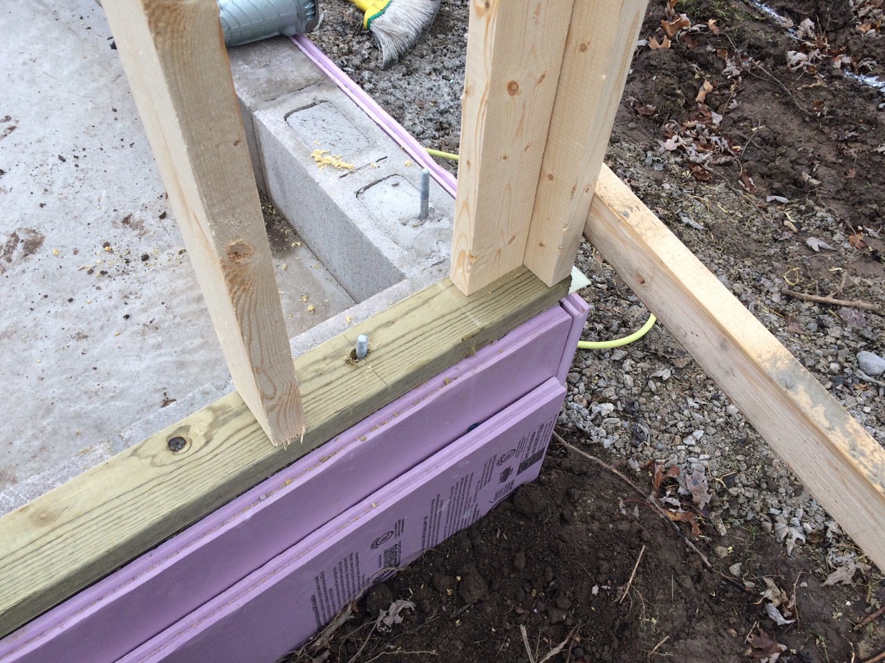 Next, we rolled out a “sill seal” – a thin layer of foam that acts as insulation and sealer between the concrete stem wall and the sill of the wall. Then it was time to lift the stud wall up onto the concrete, lining up the holes in the bottom with the existing bolts sticking out of the concrete. After that, it was a matter of bracing the two ends of the wall and making sure it was perfectly vertical with a level.
