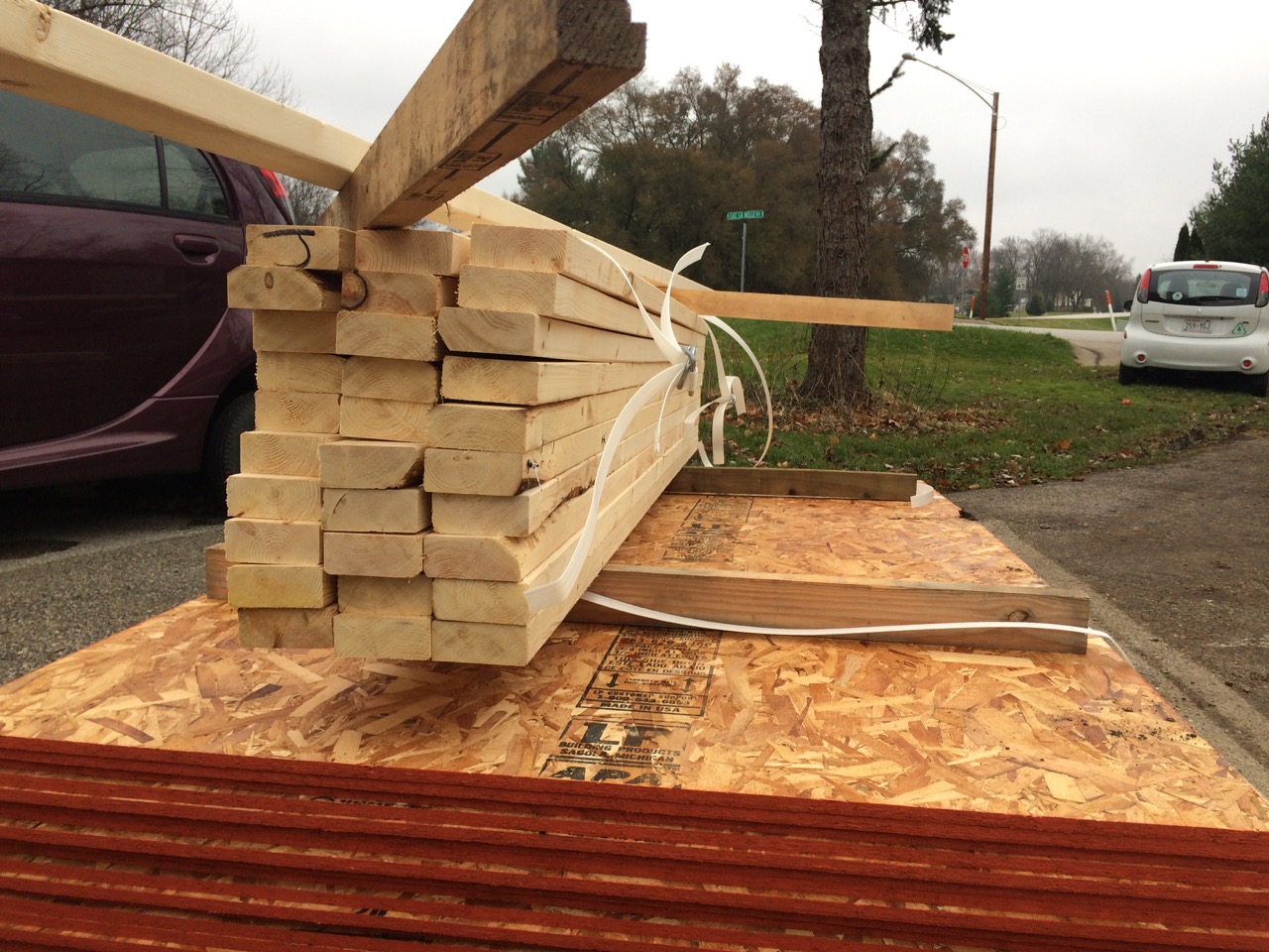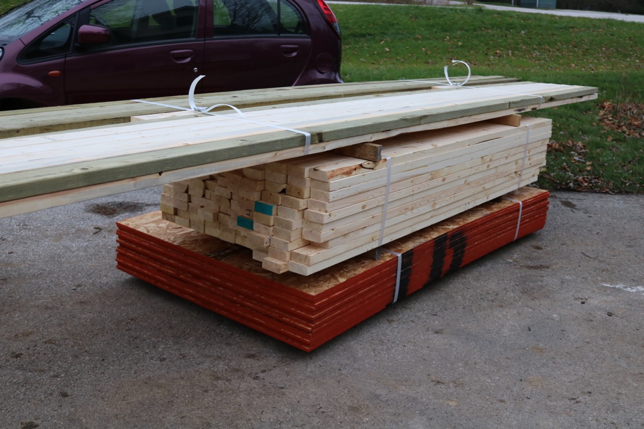 First thing, the lumber yard dropped off a pile of materials. The stack included 16′ 2x4s, pressure-treated 2x4s, pre-cut studs, and 1/2″ OSB sheathing.