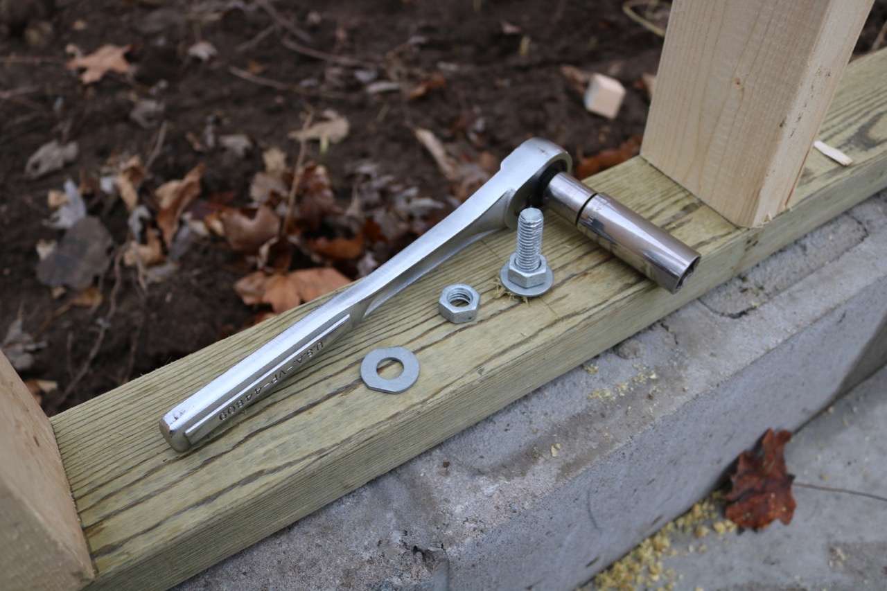 Starting from the north-west corner of the garage, we marked out the location of the bolts already cast into the masonry wall on a pressure-treated 2×4. We drilled through those holes, test fit that sill board on the wall, and then pulled it back off. Next, we marked every 16 inches, which is where the studs will go. This line was also marked on a matching 2×4, which becomes the top of the wall. Between the two boards, we laid out 2×4 studs and put two nails into each end. And with that, we have our first section of wall built, although still laying on the ground.