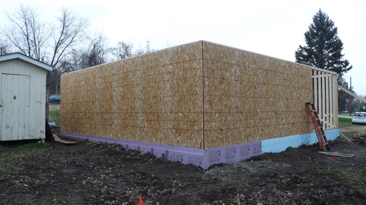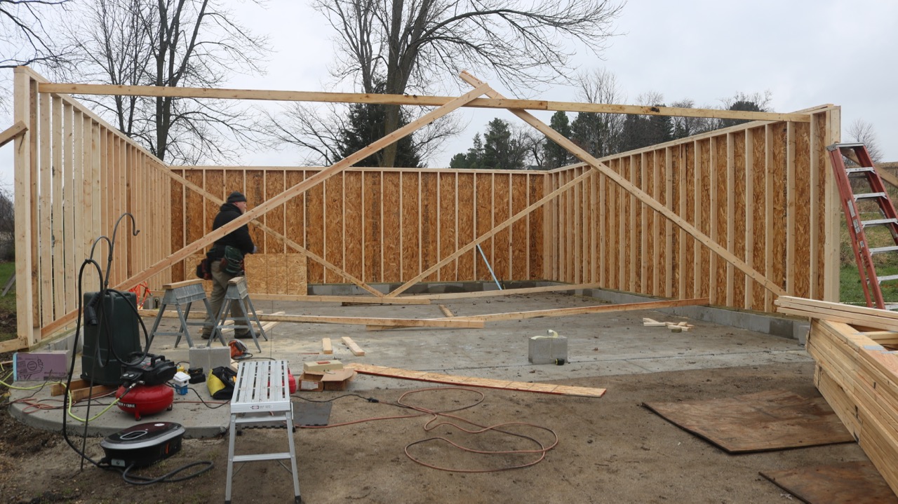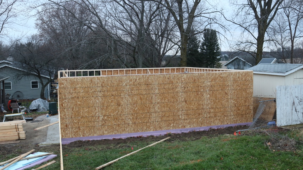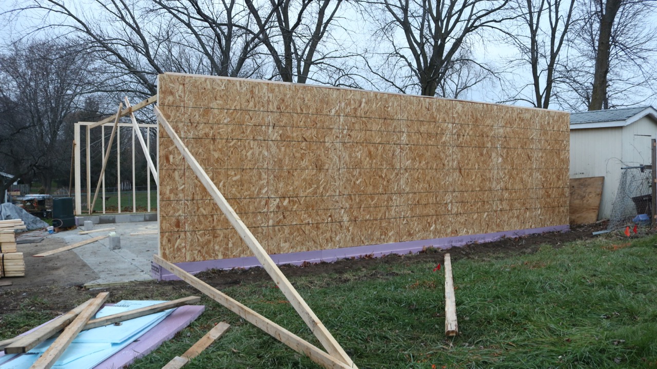 So, at this point, we have the three walls up. They are sheathed and braced, so no worries about wind while we wait for the beam. After we get that installed, it will be time to put up the trusses, which will be a feat in itself and will require some additional people-power, as the trusses are 214 pounds each!
