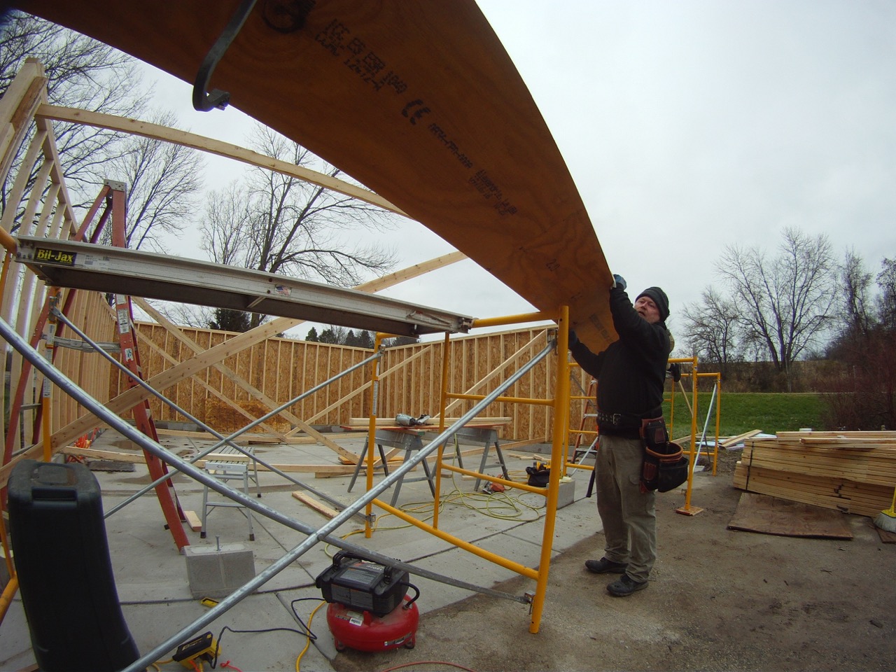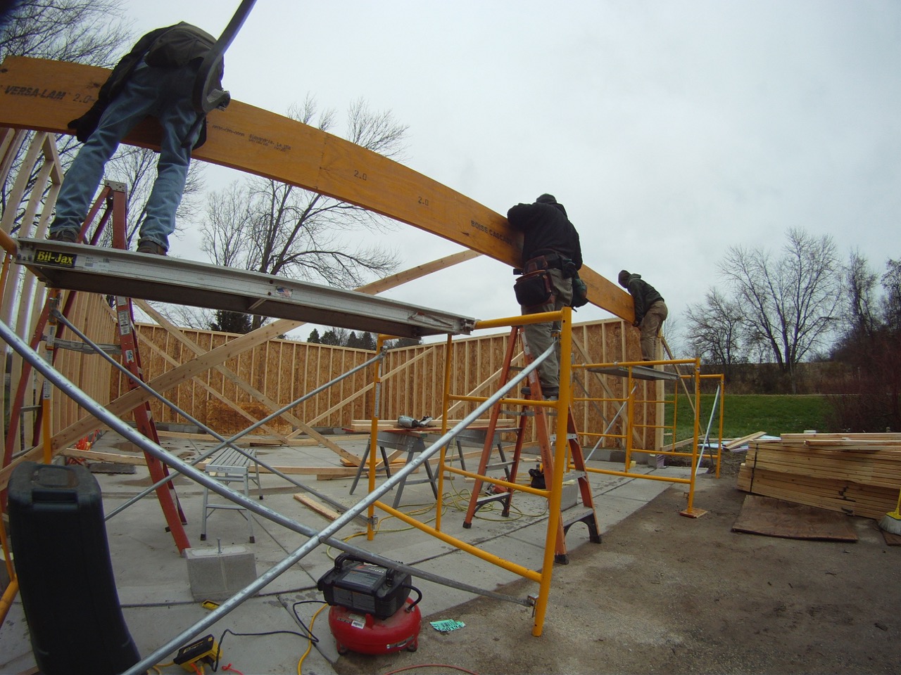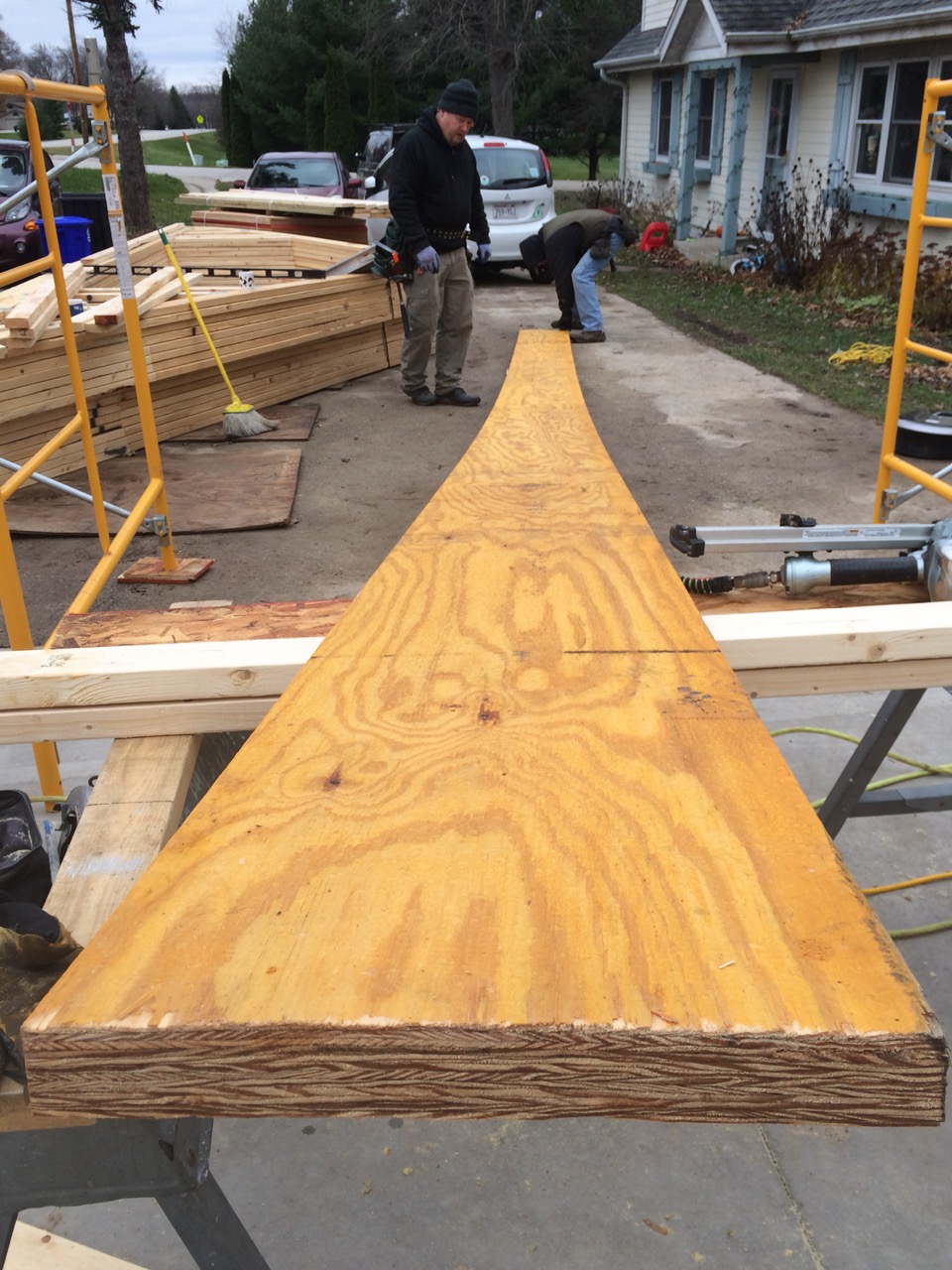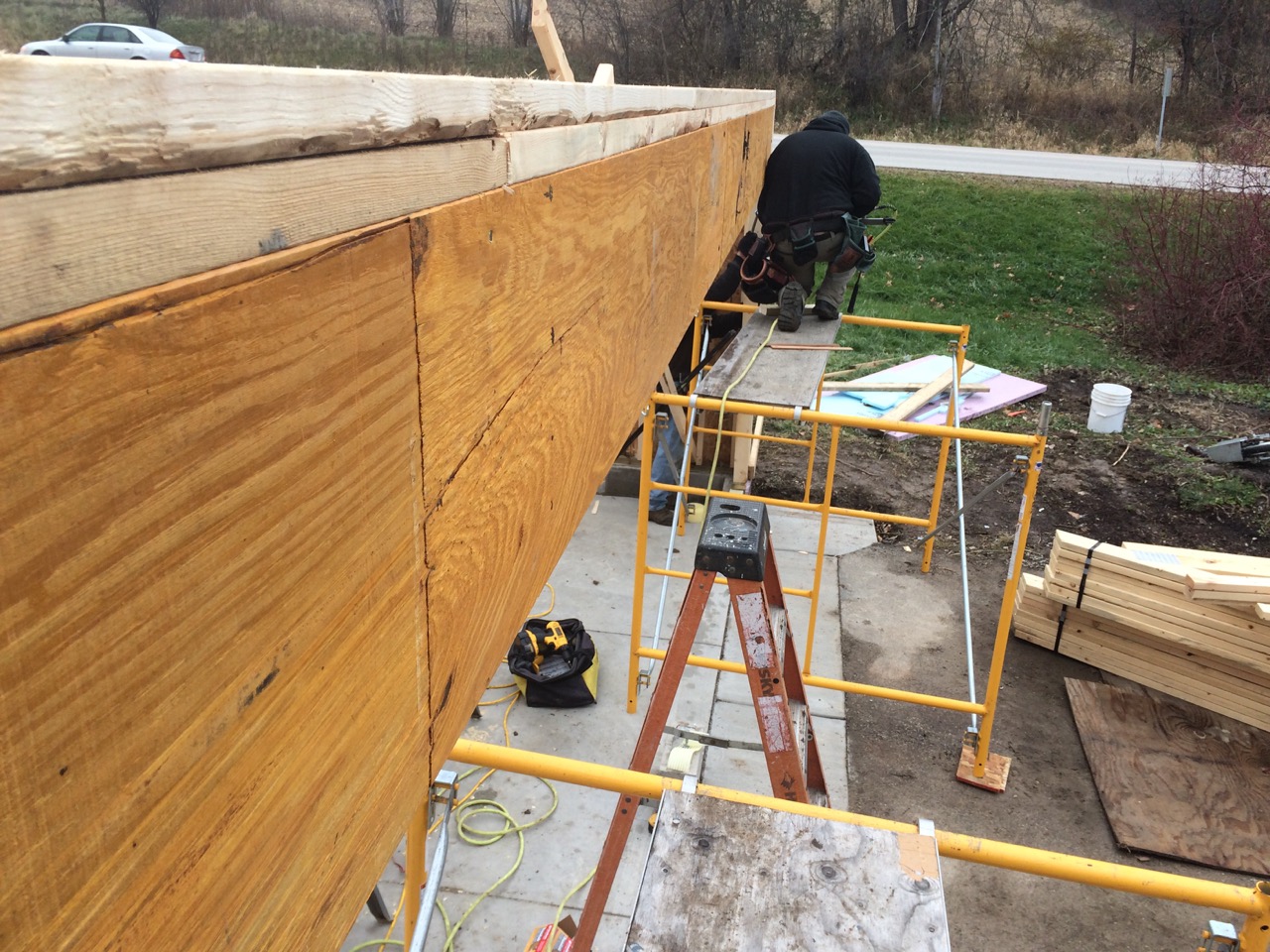 Next, we brought over the one micro-lam and cut it to the correct length (the order was for the closest stock size to what we needed.) Using some scaffolding, we had a good place to stand. We got one end of the beam onto the one scaffold, then the other end on the other scaffold. With one guy in the middle on a ladder, we lifted the micro-lam into place, then nailed it.