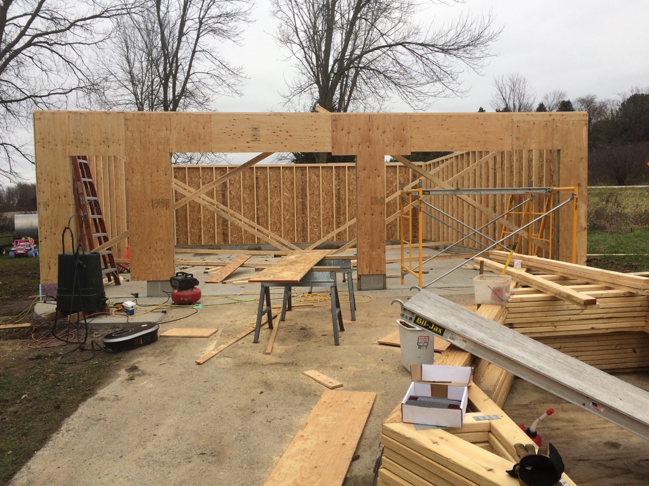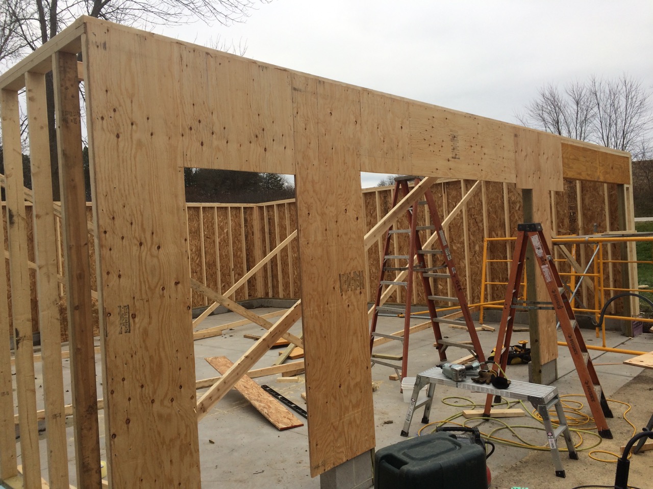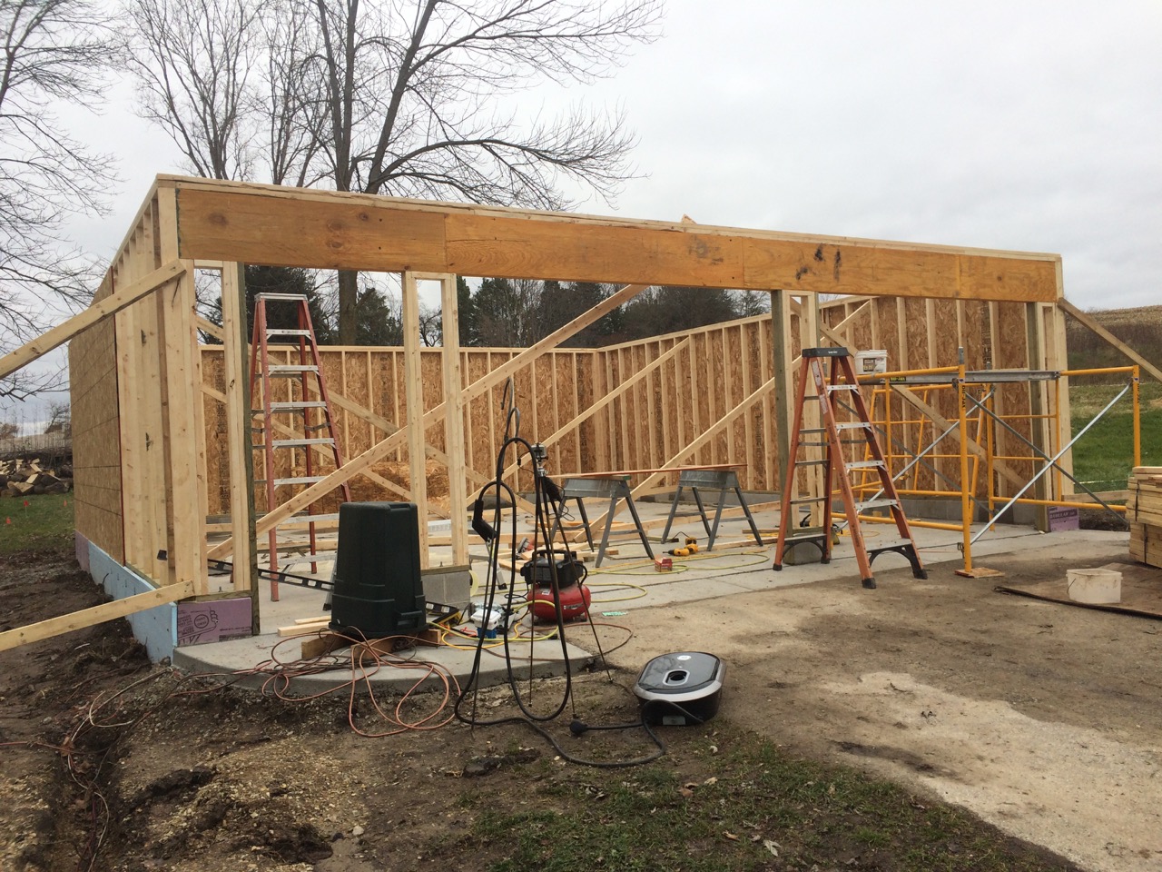 The next big step would be install a header across the south side of the garage. This wall is almost nothing but doors. In fact, there’s so little there to hold up the roof that we needed a structurally engineered beam to span the entire south side!
