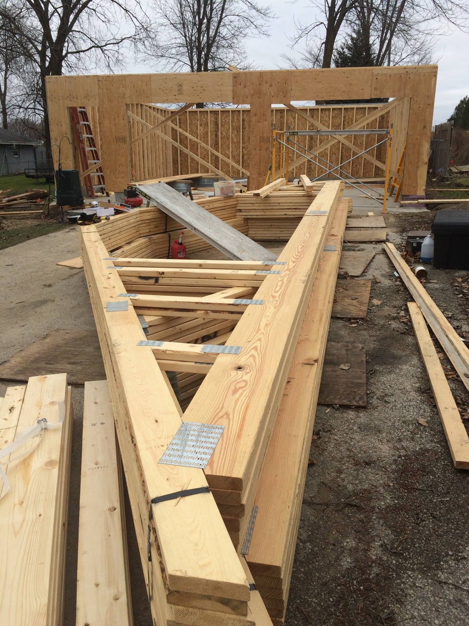We needed to get the trusses up onto the roof the next day. Each one weighs over 200 pounds. (Check out the blog about when the trusses got dropped off to see how big they are!) I had to work in the evening too. So, I put out a desperate call for help on Facebook and started making as many telephone calls as I could driving to and from work for the evening. But would people show up? Crossing my fingers!