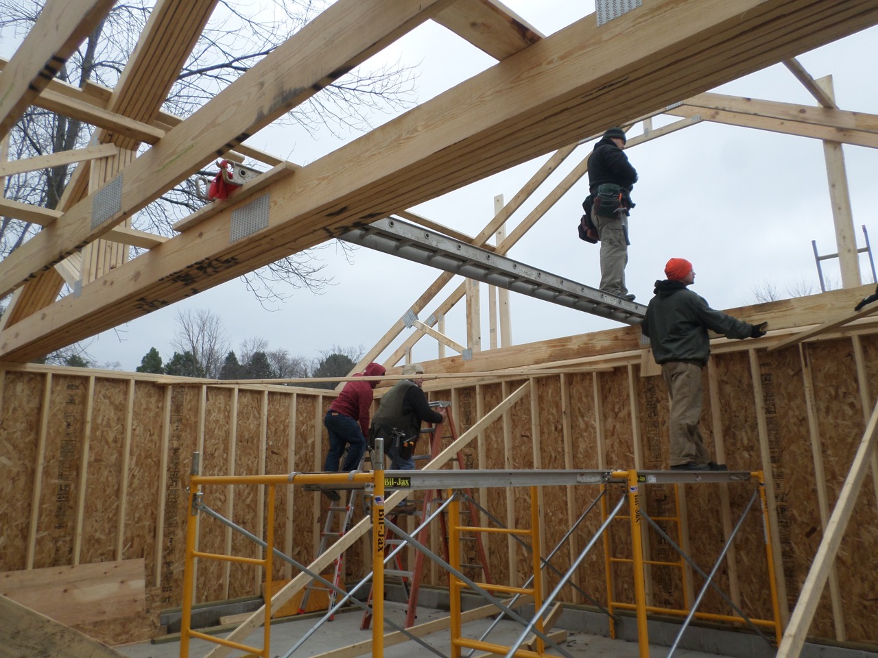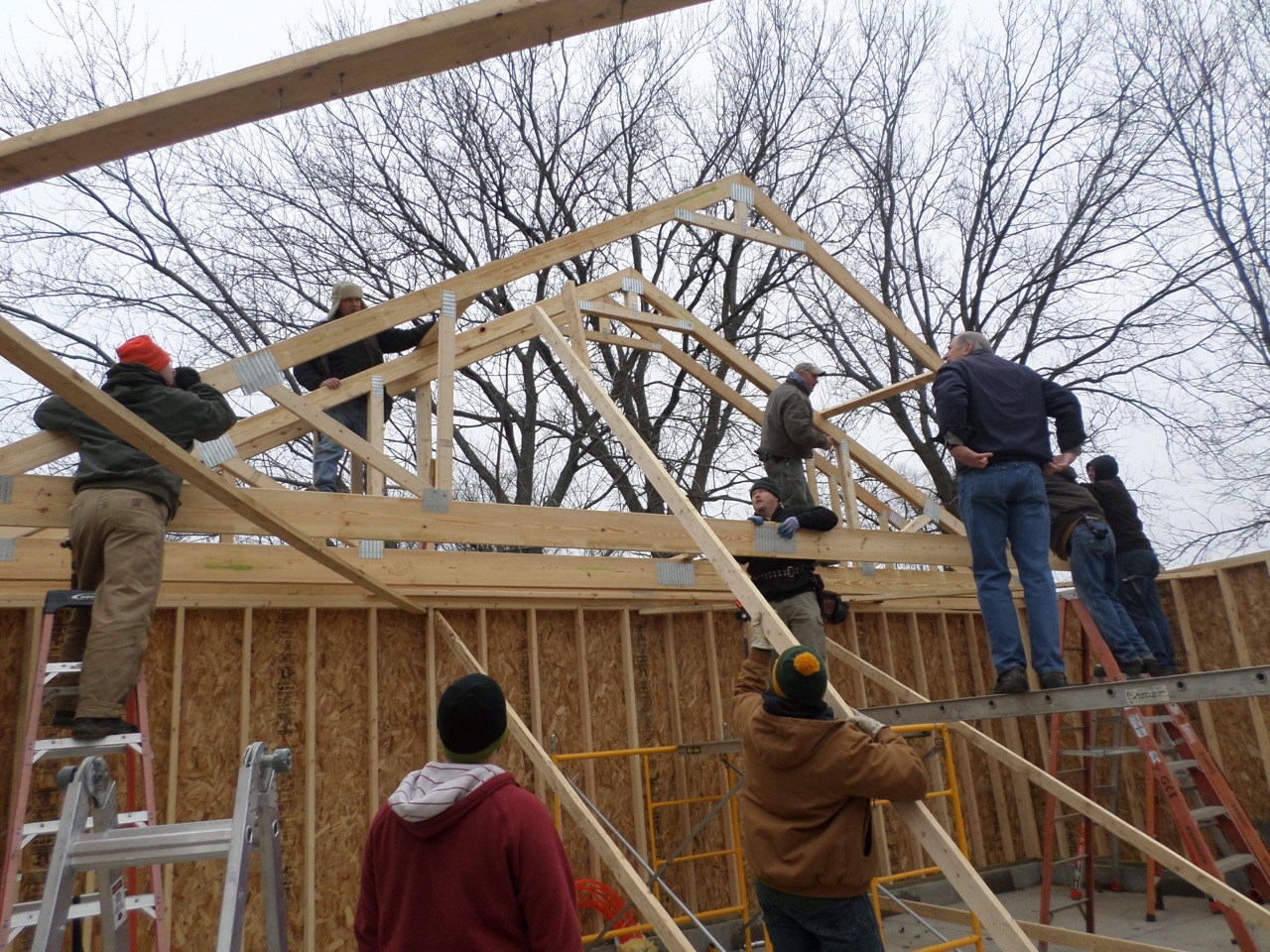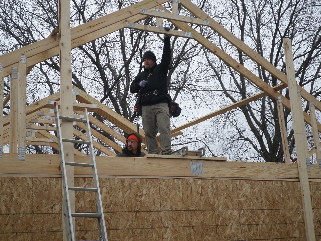 After that, we were able to set the trusses on regular two-foot-centers. At this point, having lots of extra guys really helped. We were able to get into a slow but steady rhythm of placing trusses.