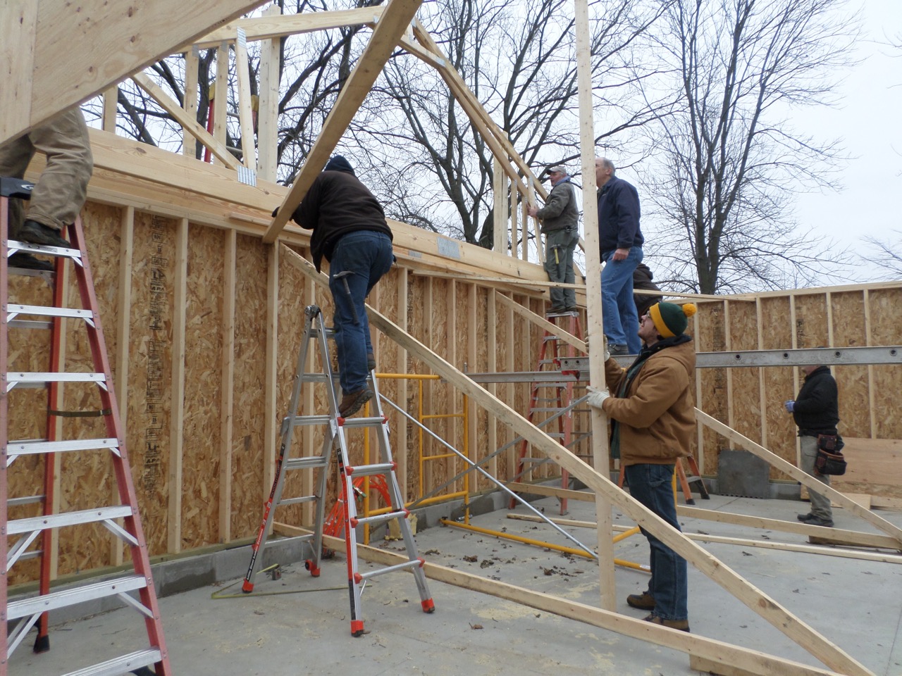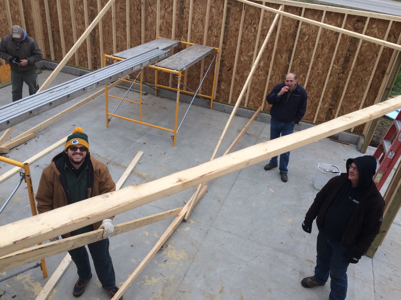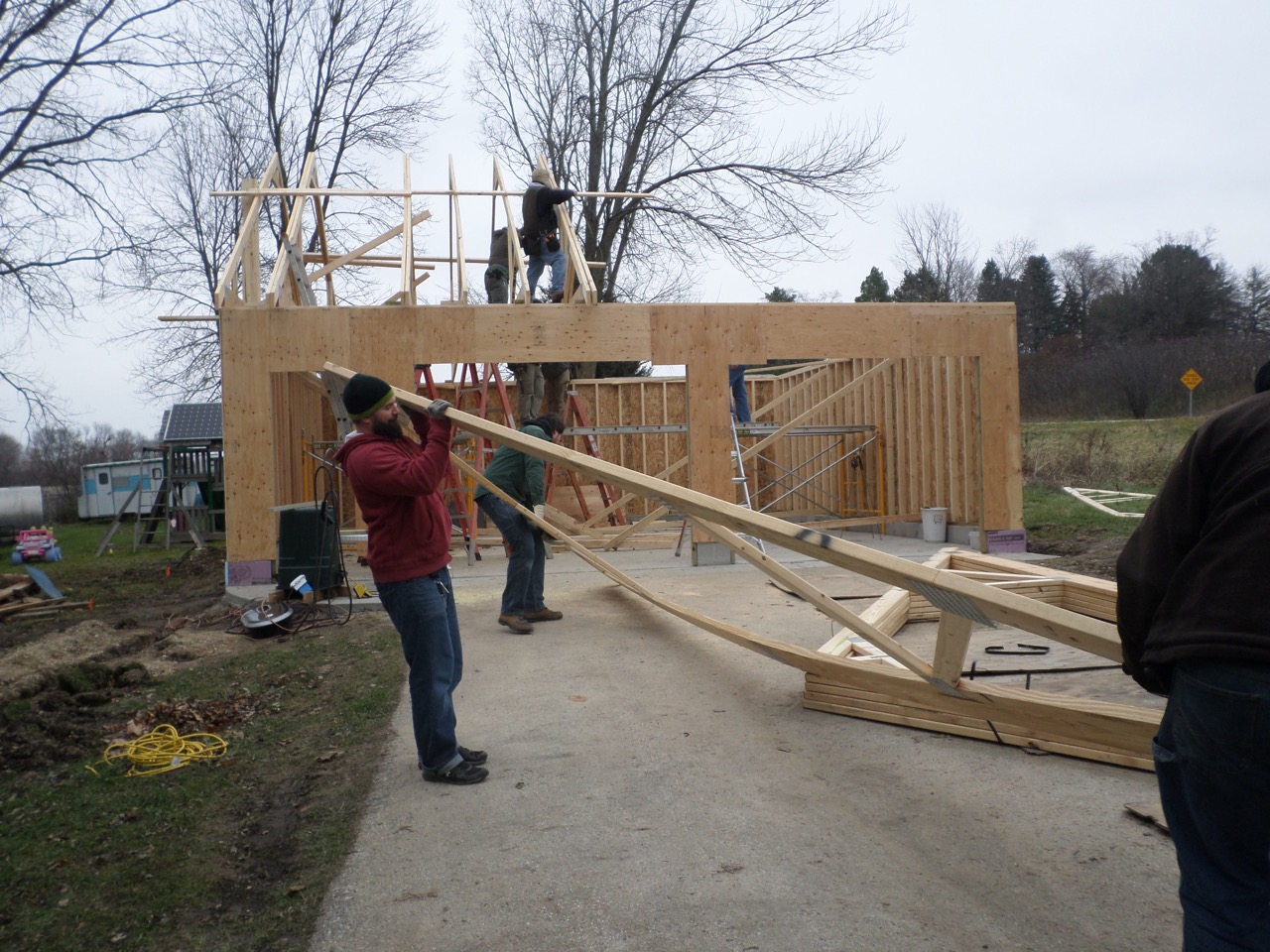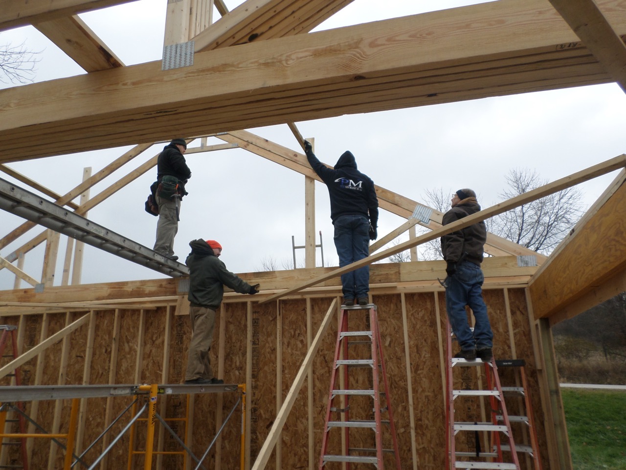After that, we were able to set the trusses on regular two-foot-centers. At this point, having lots of extra guys really helped. We were able to get into a slow but steady rhythm of placing trusses.