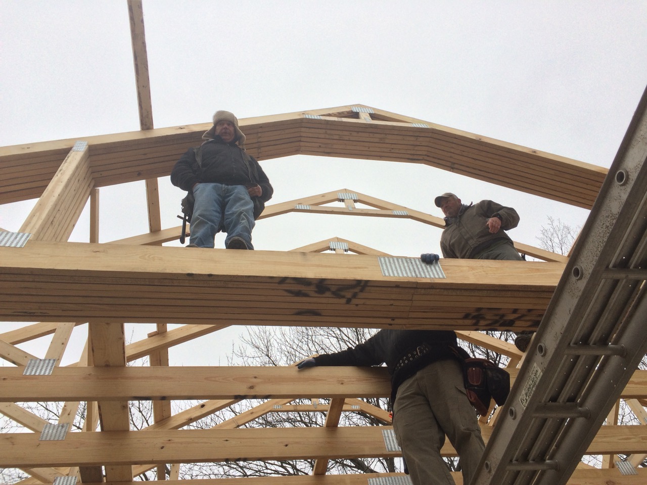 I was a little concerned about this. Each truss weighs over 200 pounds and is 31 feet long. We would need more than just my brother, my Dad, and I to do the job of lifting the trusses onto the roof, setting them in the proper place, plumb them, and make sure they stay there.