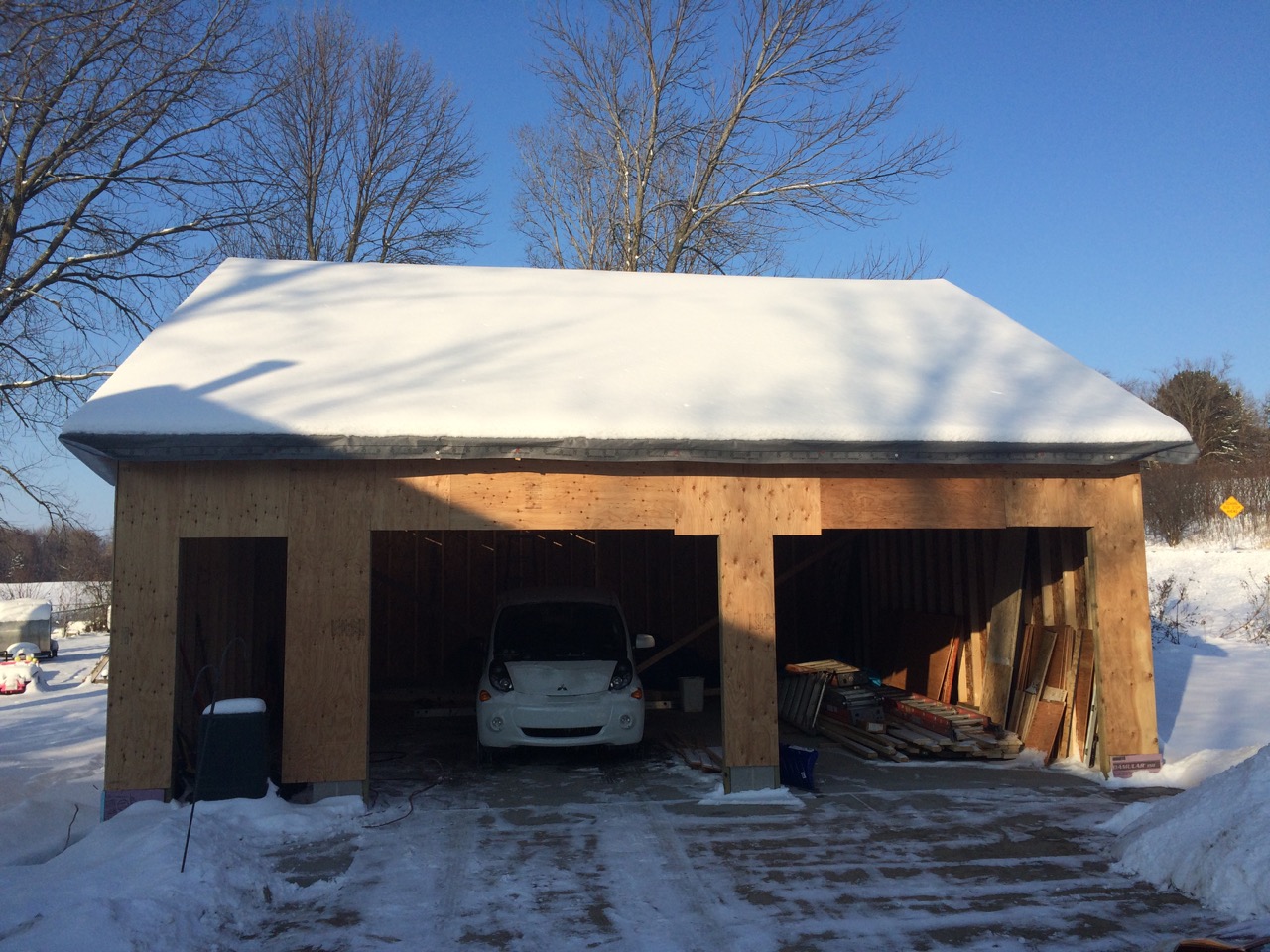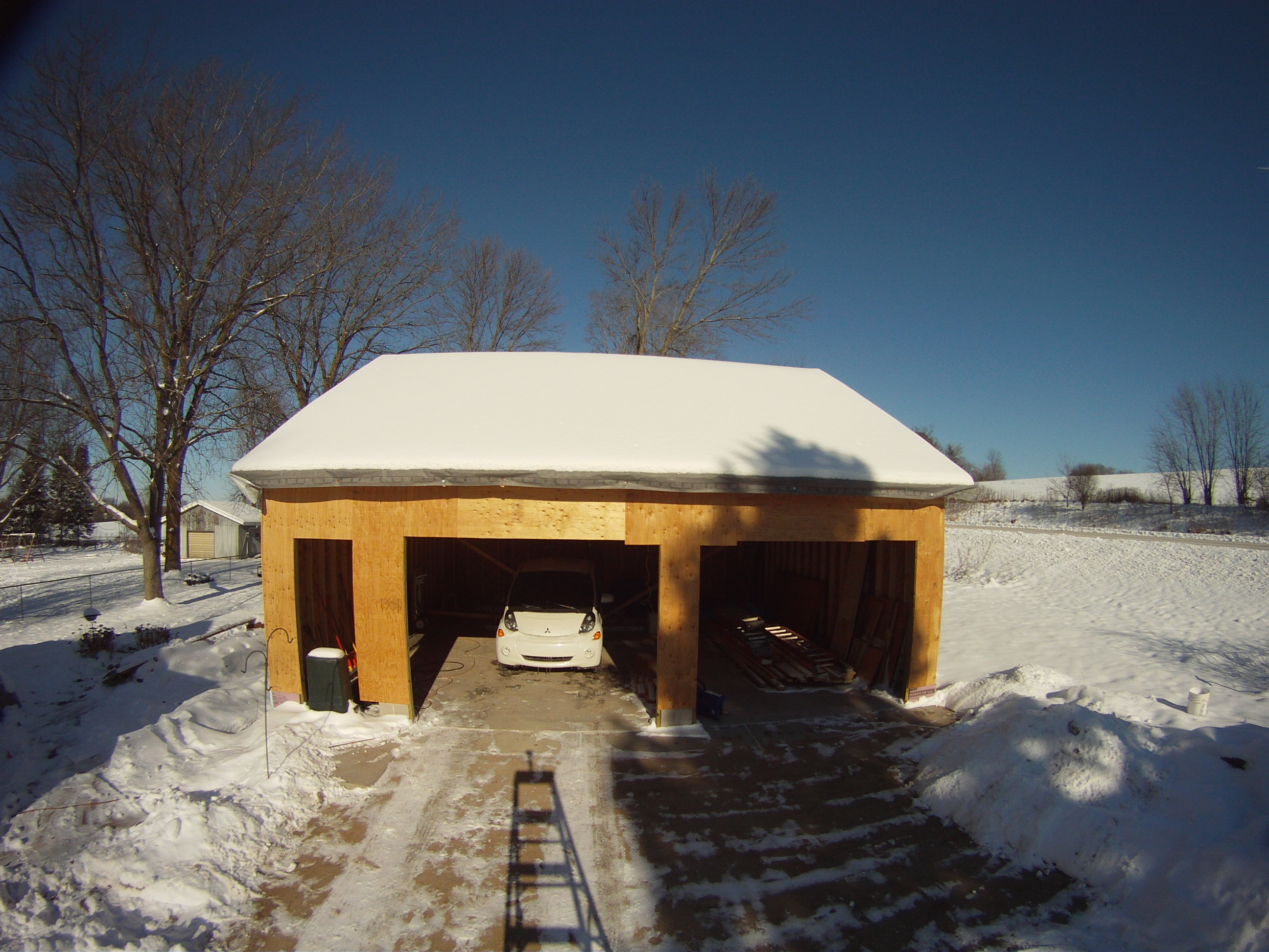 The rough shell of the garage is now up! We got the roof boards and felt on just before the first major winter storm of the season. Since then, a cold front has moved through. While that DOES drop the temperature (single digits F. right now,) it also means CLEAR skies! It’s cold, but sunny!