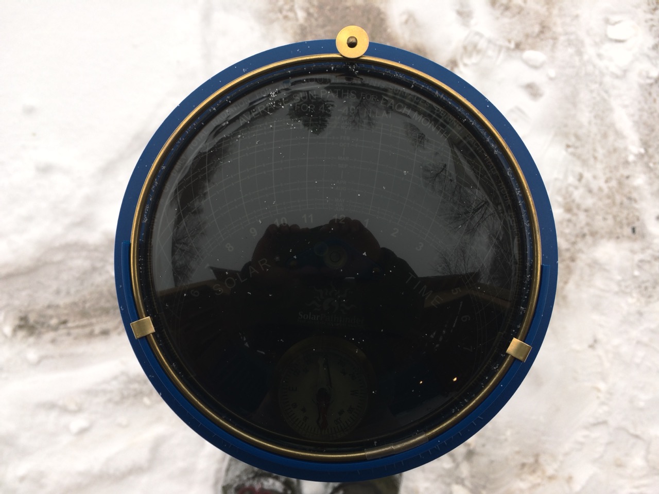 With the Pathfinder pointed straight south, I laid in place the piece of black paper that comes pre-printed with lines marking both the time of day and height of the sun at each month. (More than one diagram is included. I used the one that most closely lined up with my latitude.) On top of that, I placed the smoked plastic dome. Looking at the dome, I can see both the reflections in the dome AND the white markings on the paper UNDER the dome.