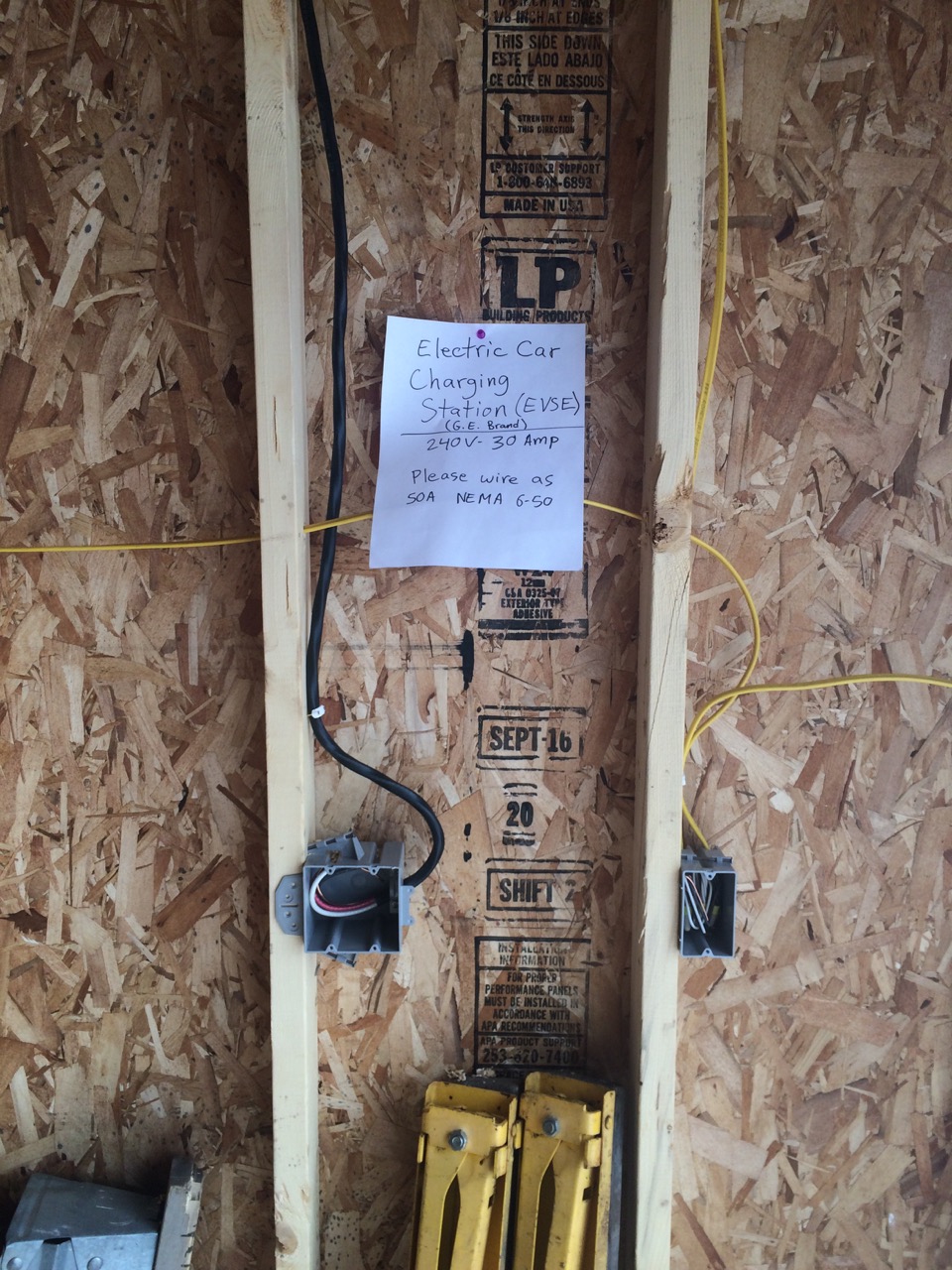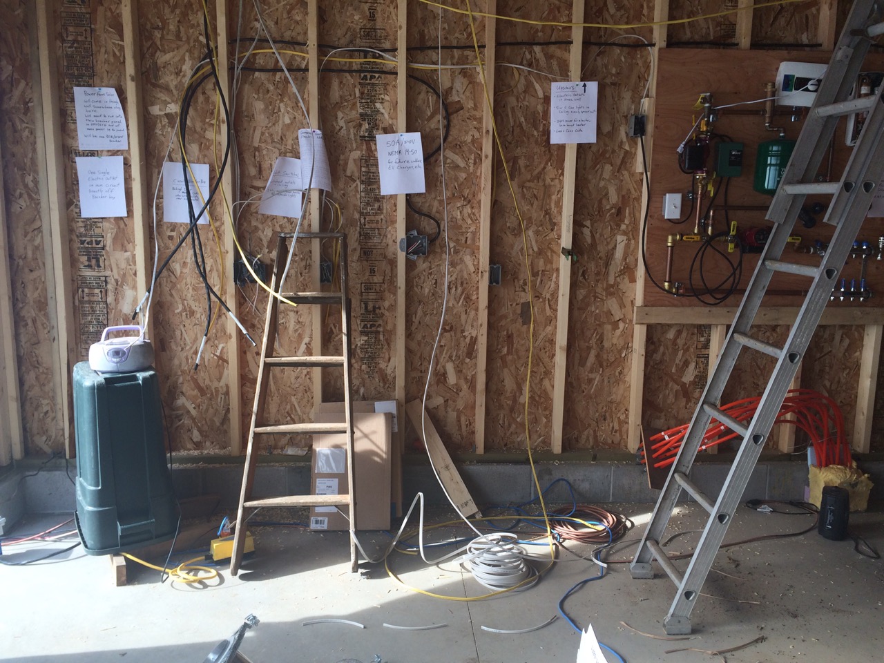 Ross the Electrician has been over a few times lately, and got most of the rough wiring done. The downstairs is wired for plenty of wall outlets, two electric car chargers, an electric boiler, and plenty of switched outlets in the ceiling for the LED shop-lights. There will also be two outside electric outlets, one each off opposite corners. Upstairs will also have 240V power for baseboard heaters. A line of can lights runs straight down the middle of the upstairs. Those will be on a three-way switch, so they can be flipped from upstairs or down.