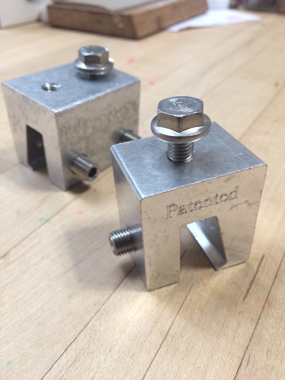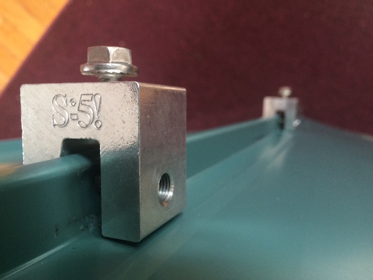 I ordered a pair of s-5! clamps and tested them out on a sample of my metal roofing. These clamps pinch right onto the seam, without going through it. So, they hold fast to a metal roof, but without requiring penetrations, flashings, or sealants. I went so far as to set up my roofing sample on end and literally stand on one foot on the S-5! Mini clamp. It didn’t budge! Dang powerful for a small block of aluminum and a set screw!