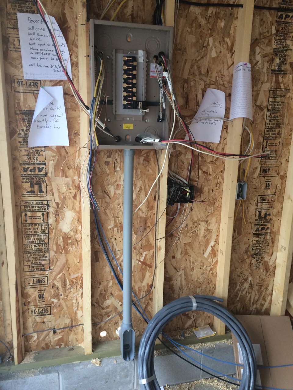 The main breaker box is in, but the new extra-heavy-duty cable going to the house isn’t yet. I dug a trench the last day of above-freezing weather before winter hit. We’ll need to run the heavy cable from the garage to the house. In a separate conduit, we are going to have an RF Cable and two Cat5 networking cables. I figure that way I can have television, internet, and telephone/telecom in the garage. The best part of those LAN cables is that they have multiple small wires inside, which could be dedicated to communications, sensors, or all sorts of other things!