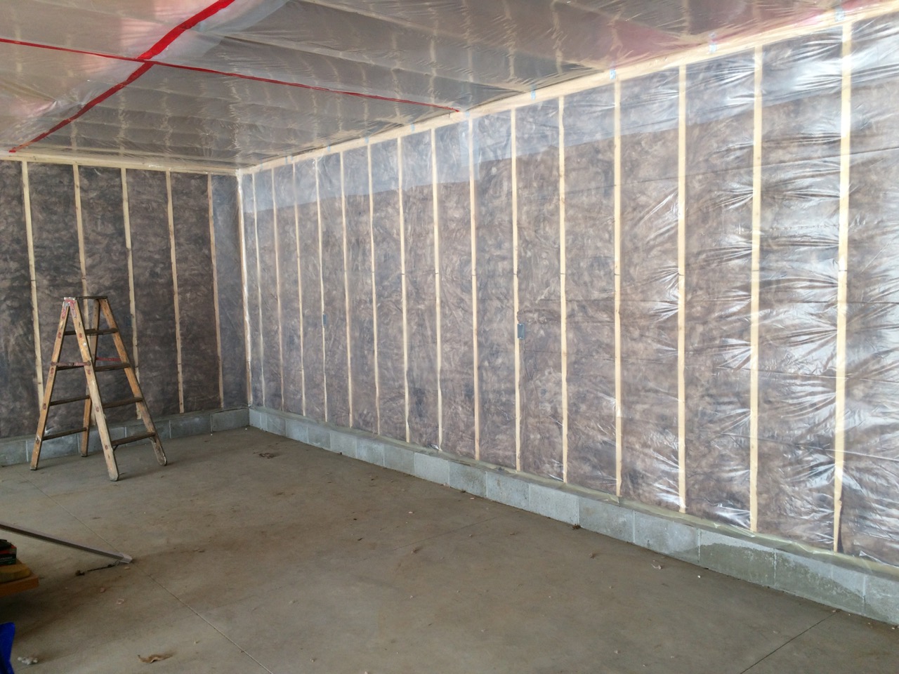 The insulation is pretty typical for stick built construction in my area. It’s R-19 fiberglass in the 2×4 walls. We already installed a layer of 1/2″ foam on the exterior of the building. That acts as a wind-break, a little additional insulation, and weather-proofs the exterior until we get the siding on. (Which will be easier to do in nicer weather.)