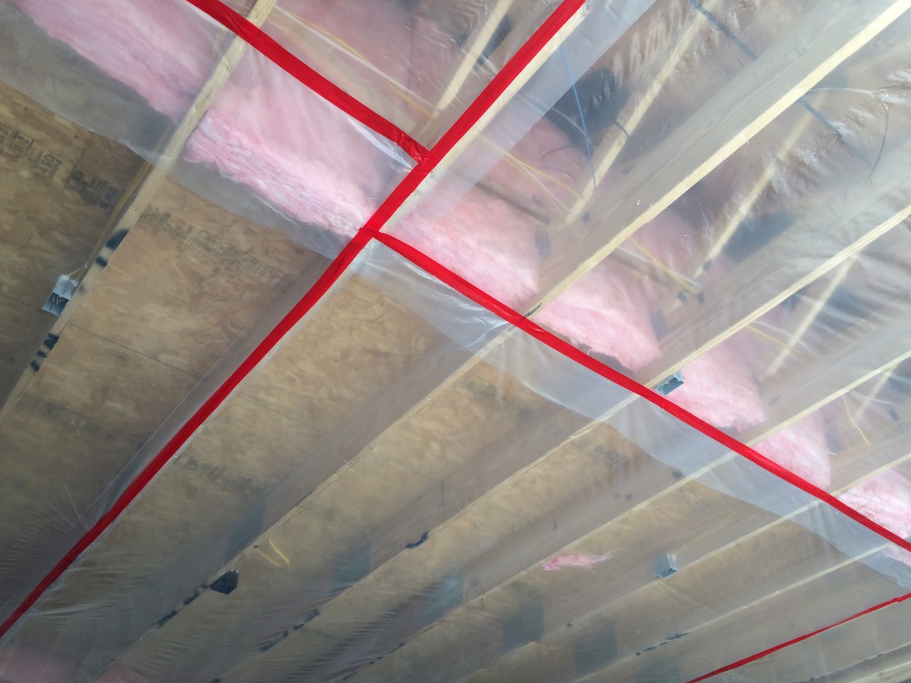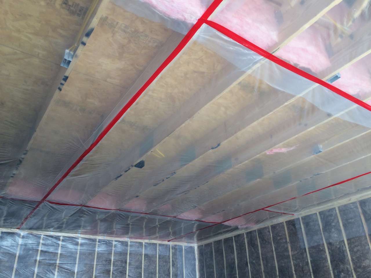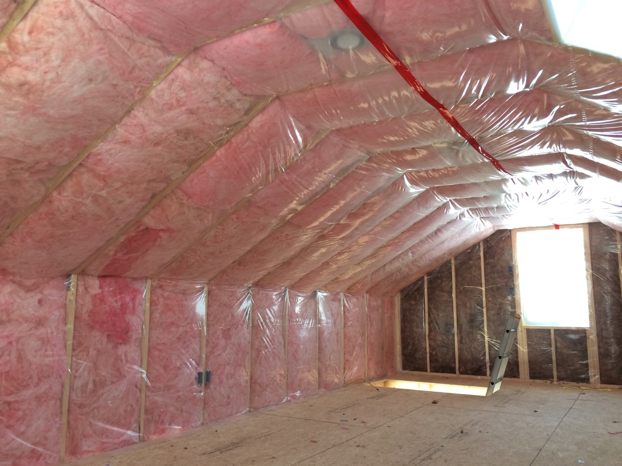 Over the top of the fiberglass is a plastic vapor barrier. All the seams were taped. Anywhere that was too small to fit insulation, but air might be able to infiltrate, was caulked to stop those air leaks. For example, between adjacent doubled-up studs. I also used the flexible version of Great Stuff around the service door and the windows before the insulators arrived.