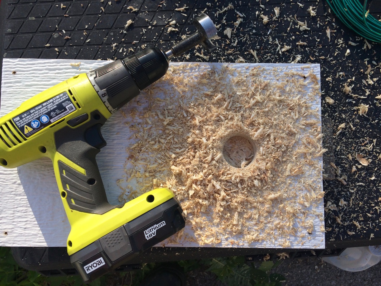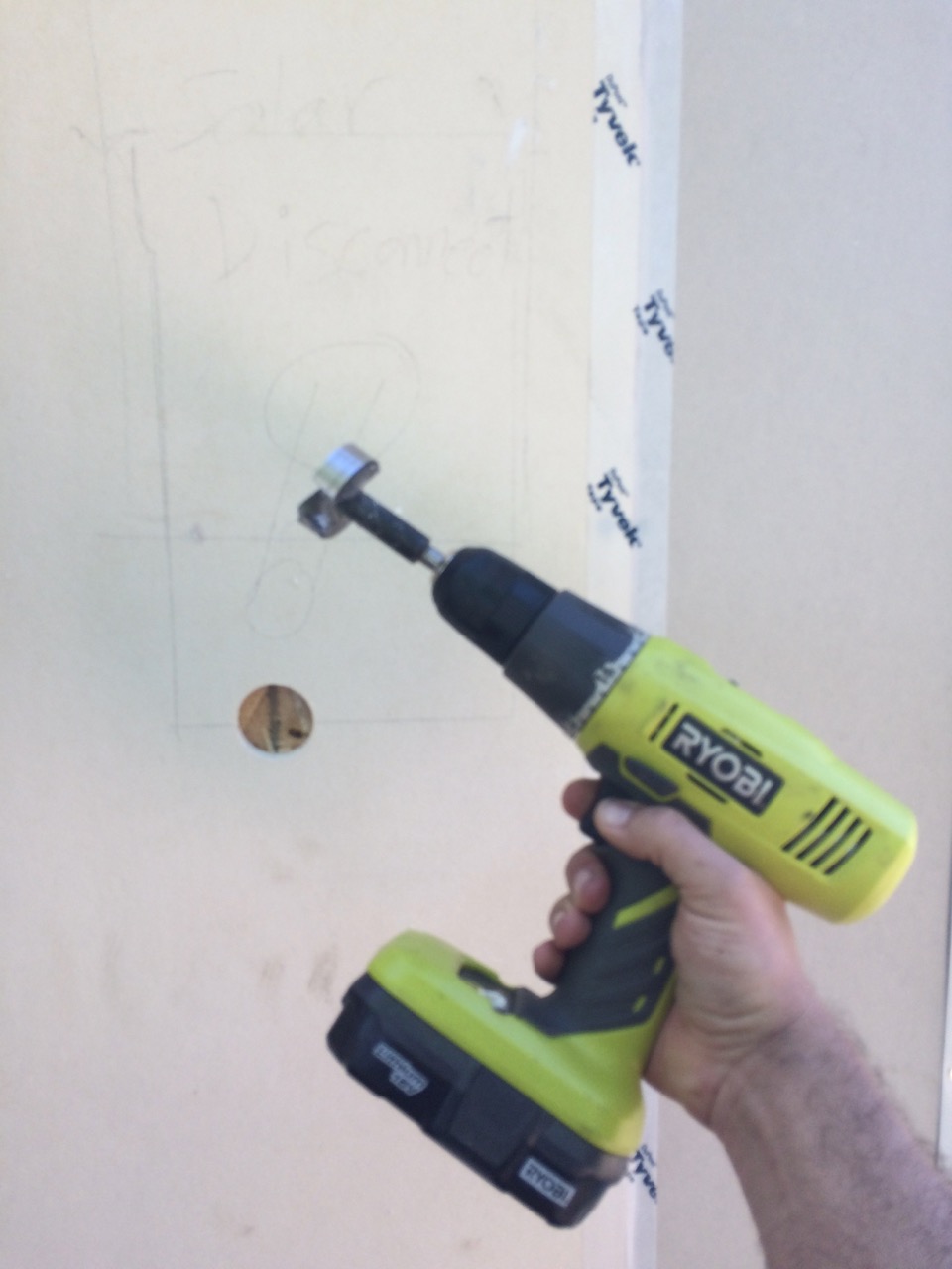 My brother had made a block which matched the garage trim on which I could install the disconnect box. This would provide a solid raised surface to install the box and a place for the siding (still to be installed) to run in to. I centered the box on the wood blocking and marked where the knock-out on the back would go. I then drilled that 1 inch hole with a Forstner Bit. On the SIDE of The MidNite Solar disconnect box there is a 1/2″ knockout for the incoming wire, but we are using 3/4″ conduit. So, Ross pulled out his step bit, and we drilled out the box for a 3/4″ connection for the wiring from the roof.