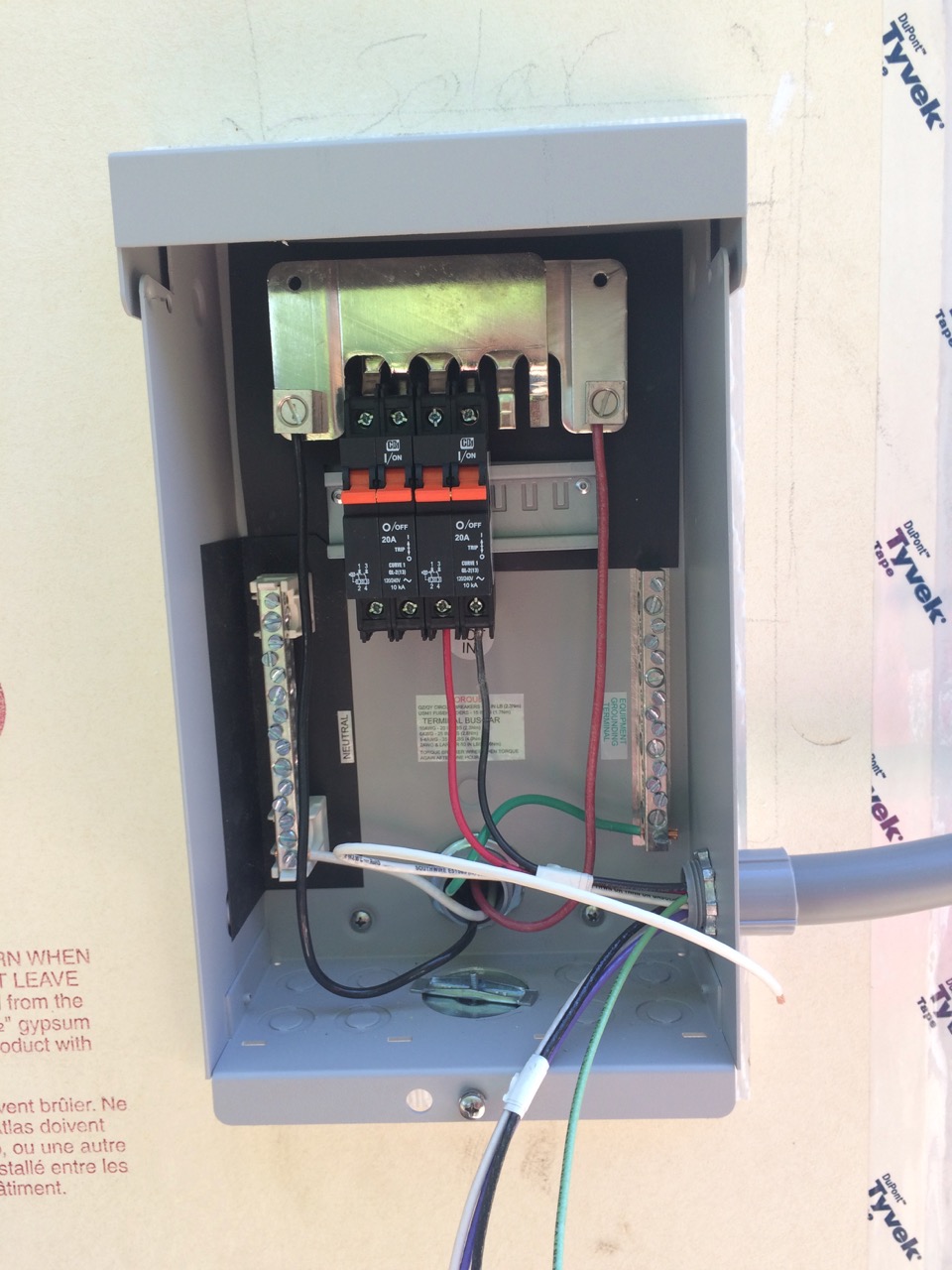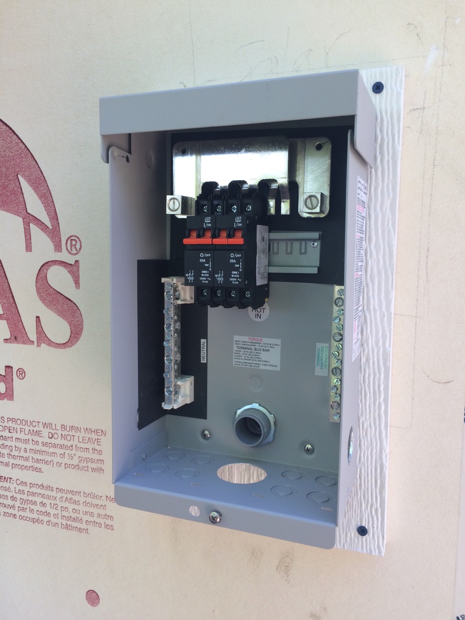 At the MidNite Solar AC Disconnect, I installed the inside cover and the slider that connects the two circuit breakers to the big red lever on the face of the box exterior. One of the few things that my Utility specifies is the exact wording on the box. I mail-ordered a red plastic sign earlier in the week, and it happened to show up that morning! I peeled off wax paper from the sticky-back tape and applied the sign to the box. I had also ordered a placard from my utility meter. My Utility didn’t specify that I need it, but many utility companies do. It didn’t cost much more to have a second sign in the same order, so I purchased that second sign and put it on my meter.