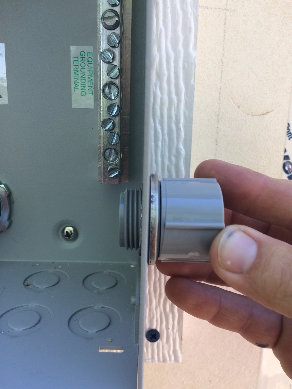 We screwed the blocking and box to the side of the building, using a short level, to ensure both were plumb (mostly to look nice.) We then ran the conduit down so that a 90 degree elbow would be directly horizontal from the hole in the side of the box. The hole in the disconnect is actually out from the wall just a bit, so we needed an offset. I already experimented with heating PVC conduit to shape it, but hadn’t done a particularly good job. Ross showed me how to measure the offset. We then cut a piece of conduit the right length and stacked up scrap wood to the same height as our offset. We then heated the PCV and put one end on the pavement, the other end on top of the scrap wood, and then just pushed and held the ends down. This made a very nice custom offset. That piece then went into the side of the box with a gasket.