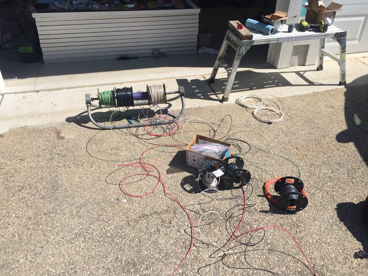 At this point, all the conduit was complete, and we could start the actual wiring pull. This project is two 20 amp 240V circuits. That’s a hot, hot, and neutral for each of the two, plus a ground wire, 7 wires total. Ross set up several rolls of wire on an extra wide reel. The plan was to feed the wiring in a straight line from the bottom box up to the middle box, and then pull just the top circuit to the top box. One of the hot wires used purple insulation (instead of the typical red) so that we had the “Purple wire group” and the “Red wire group”. This made it a little easier to keep the two circuits straight.