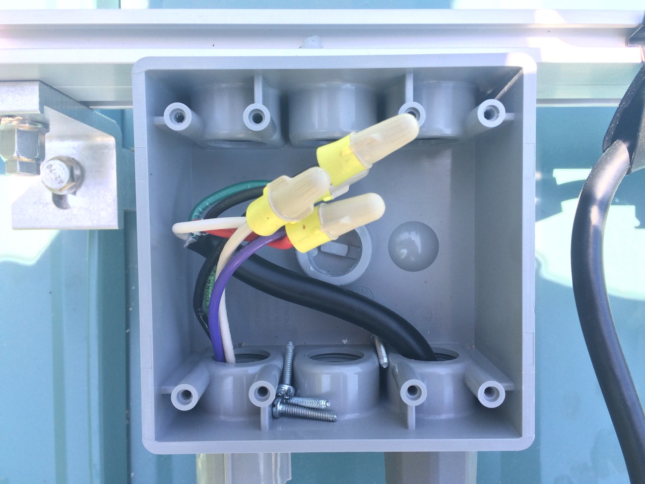 The top box was pretty straight forward. I simply used wire nuts to connect the four wires from the Enphase cable to the four wires I pulled through the conduit to the box. I put a small dab of No-Ox in each nut before making the connection.