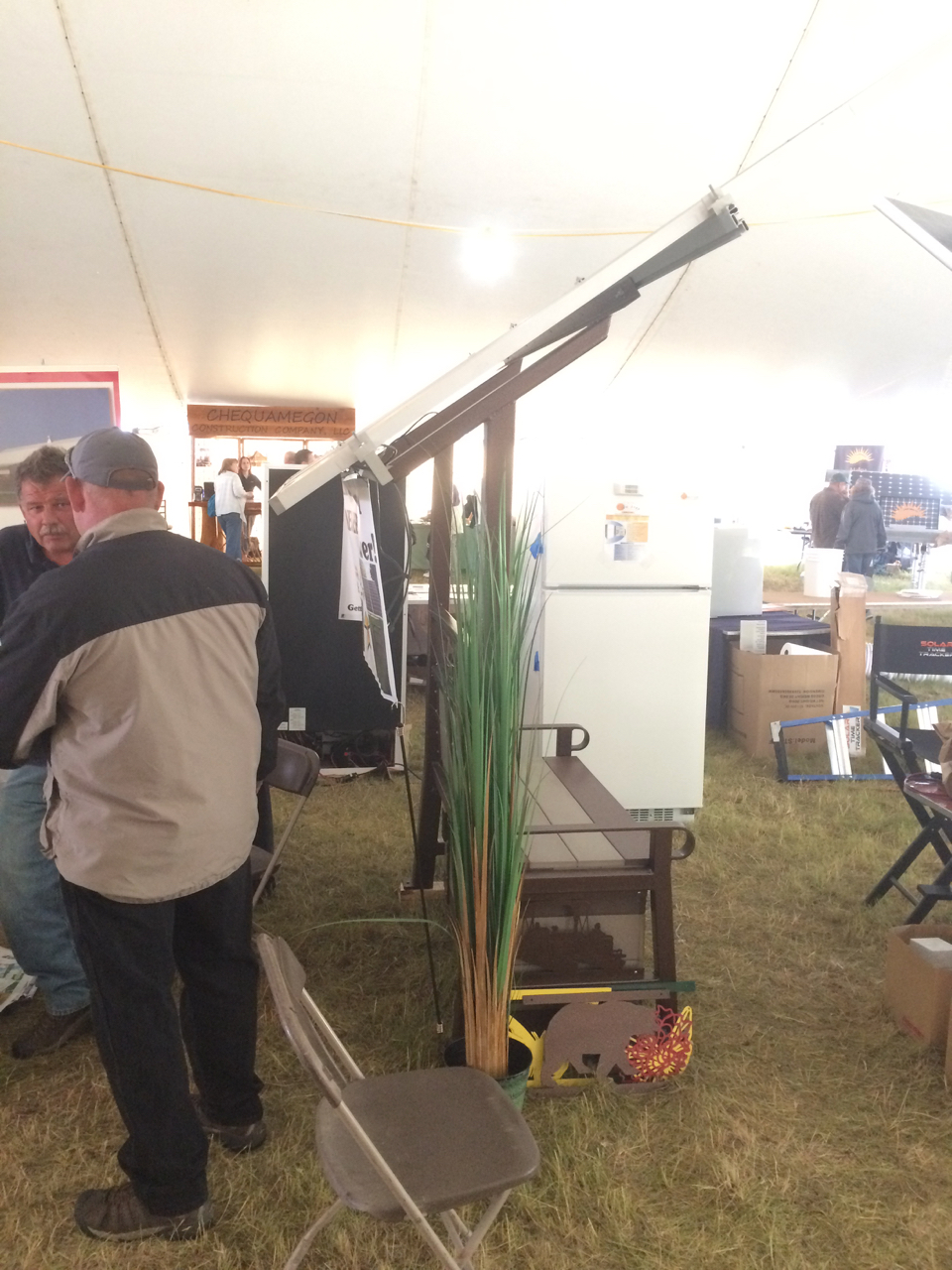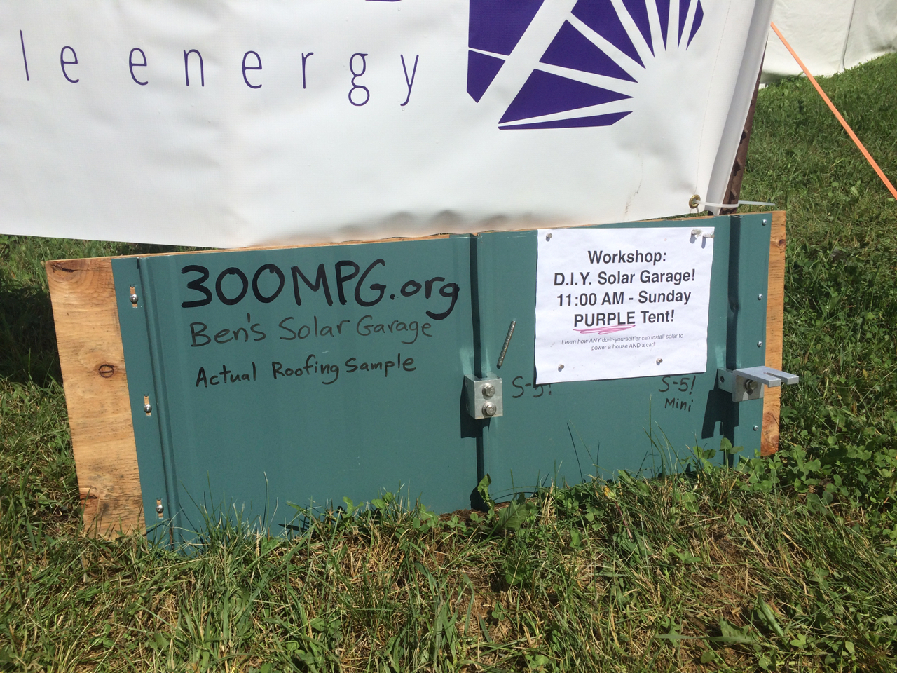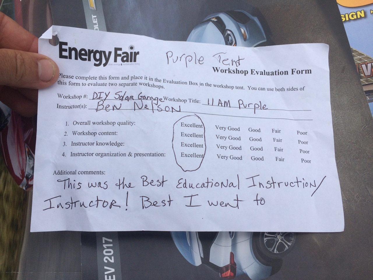I was really looking forward to giving my presentation and was glad to see that I had a full tent! I had the projector hooked up to my iPad to show off photos from my Solar Garage Project. I launched right into the specs of my solar system and why I chose products such as those by Enphase and Iron Ridge and the advantages of finding local suppliers such as Werner Electric. I also brought lots of props with me, including pieces of the racking system, a grid-tie inverter, and even a custom demo piece of my roof. I wanted people to be able to see and feel these things in person. It’s easy to show photos and perhaps give an explanation, but I was really hoping to convey the EXPERIENCE of how I built my own solar system. People seemed to like my presentation. I got plenty of positive responses, including finding the world’s greatest evaluation form that accidentally got mixed in with my papers.
