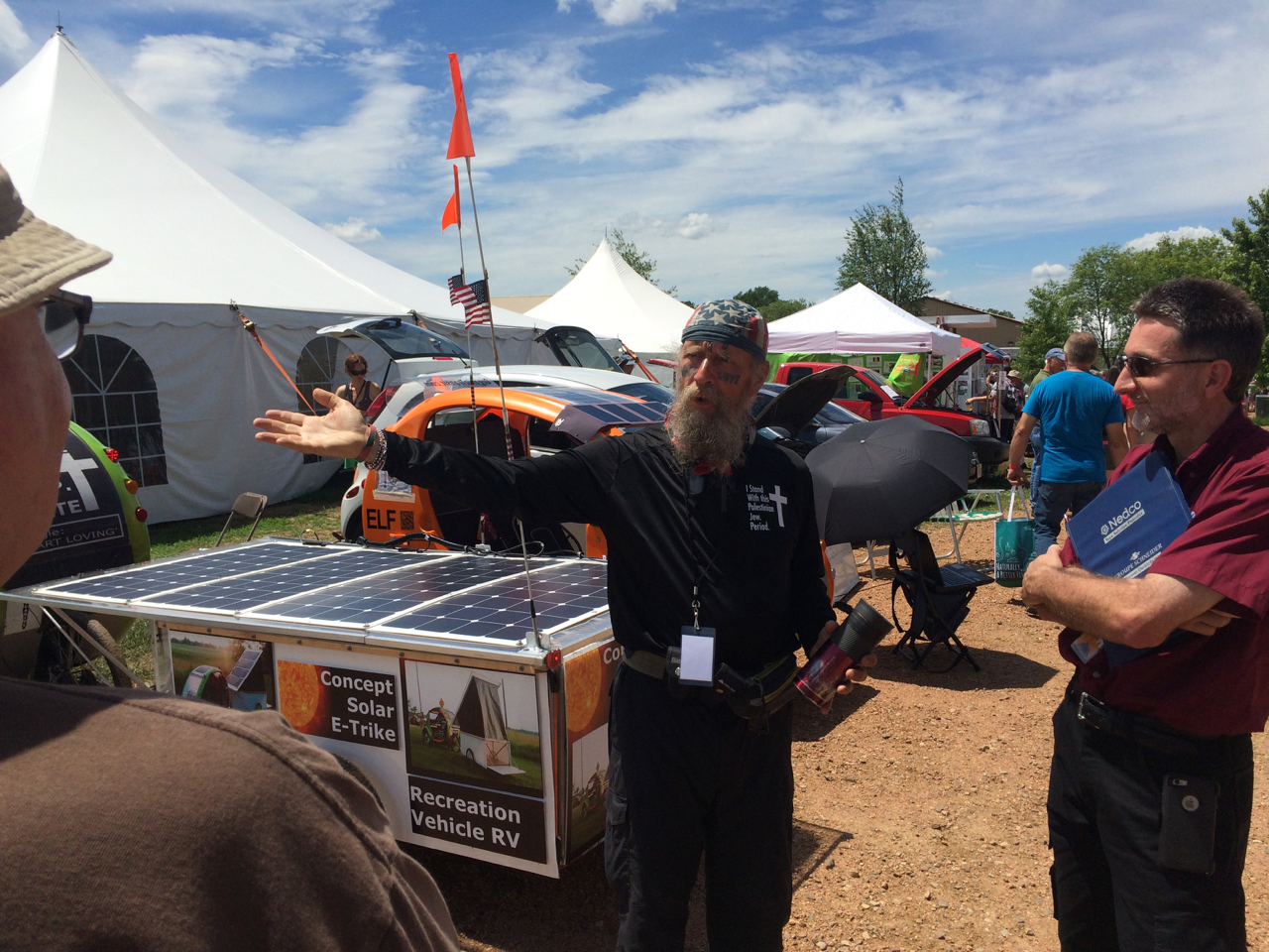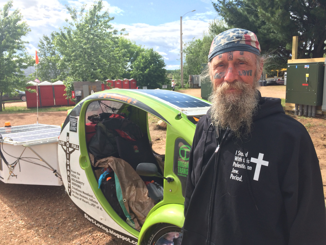 All day, James preached Love and Peace and Solar Power. James has travelled all over the country in his solar/human-powered vehicle, including to places like Standing Rock, wherever he can be of service.