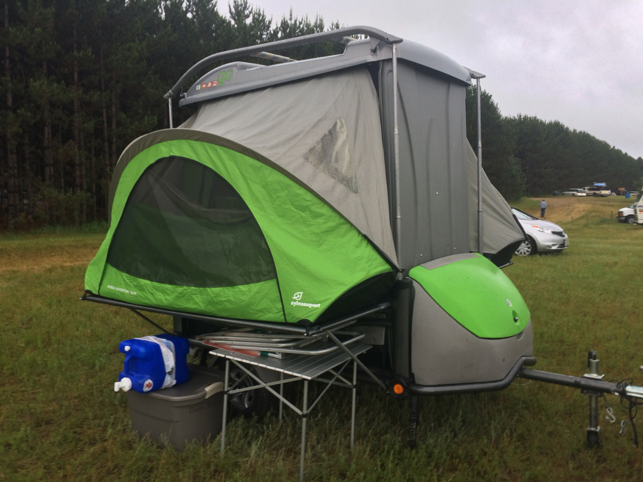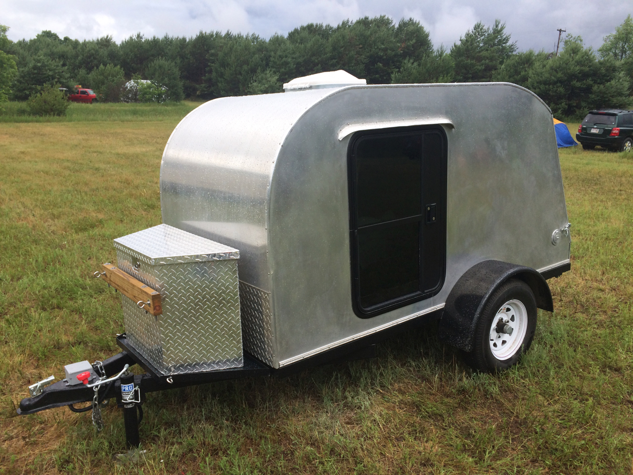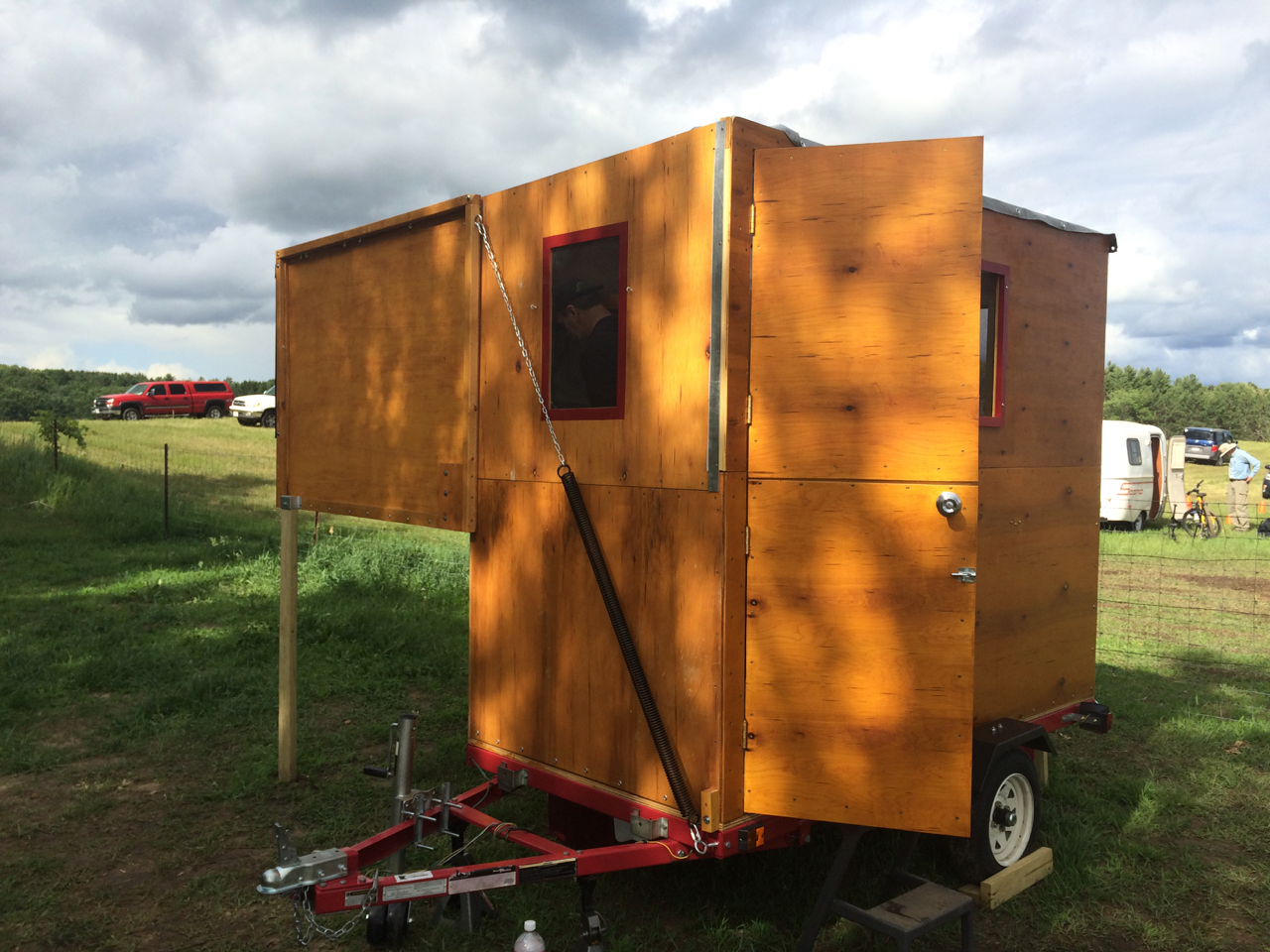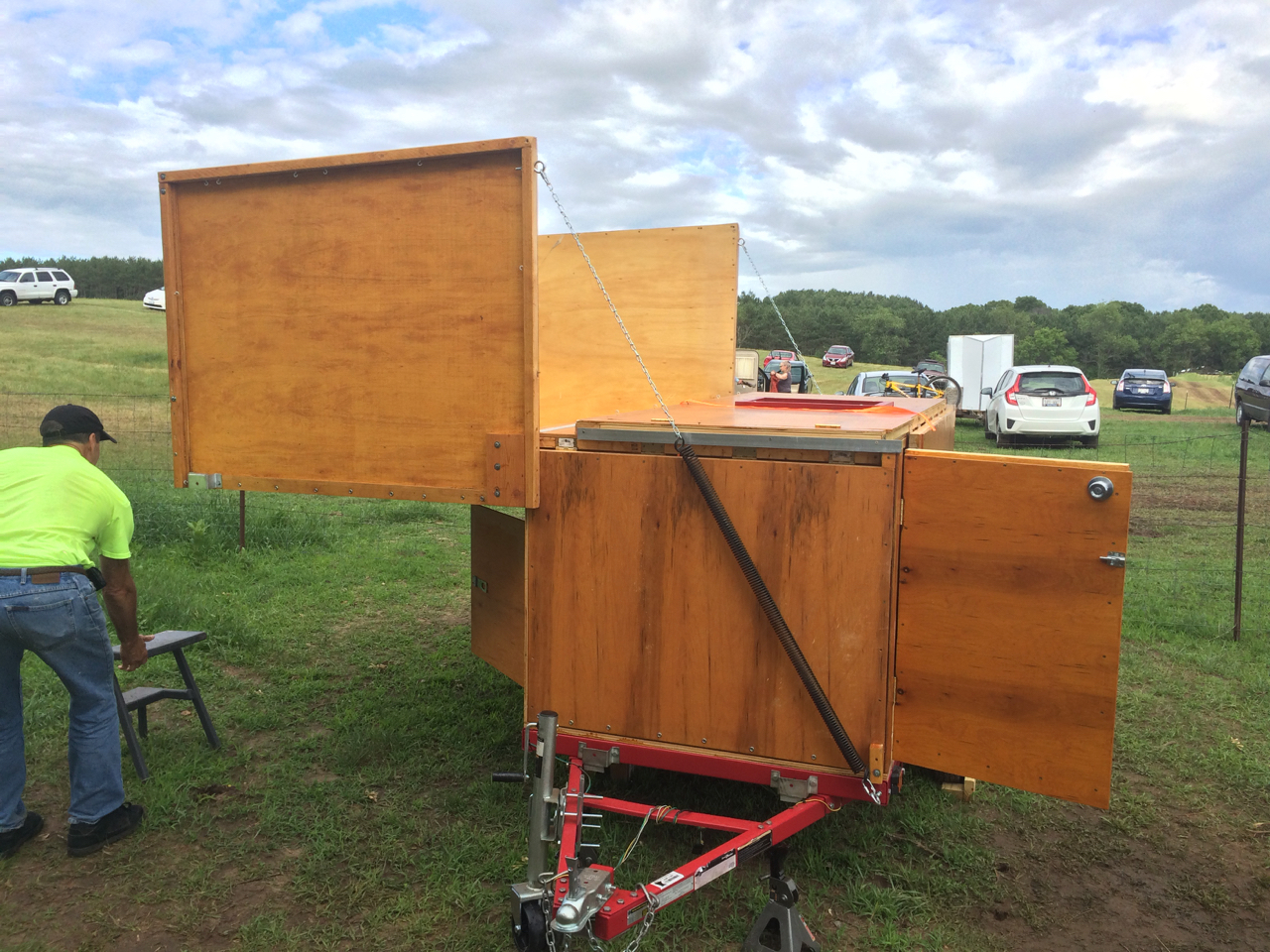 We have to put a few checks in the “New Friends” column as well. Also in the car show area was a DIY Pop-Up Camper! Being a camping trailer builder myself, I had to check this one out! I talked with the owner just a little bit. (Was it John?) The trailer had a clever design. It’s basically just plywood on a Harbor Freight trailer, but folds from fairly small to full standing height and what looked like a Queen-sized bed! You can see more of the trailer on his blog: https://diytinycamper.com