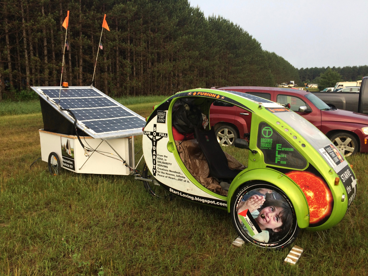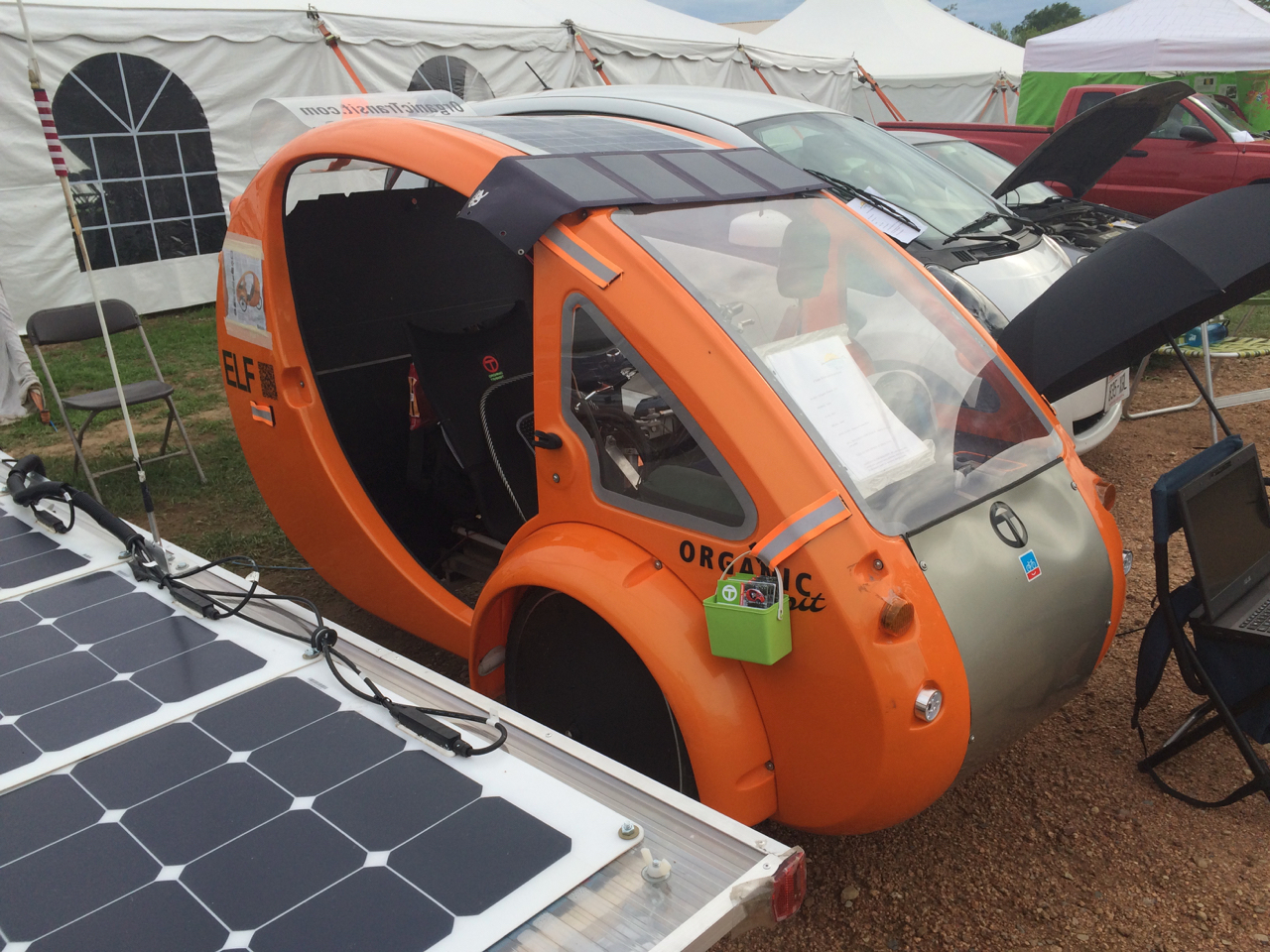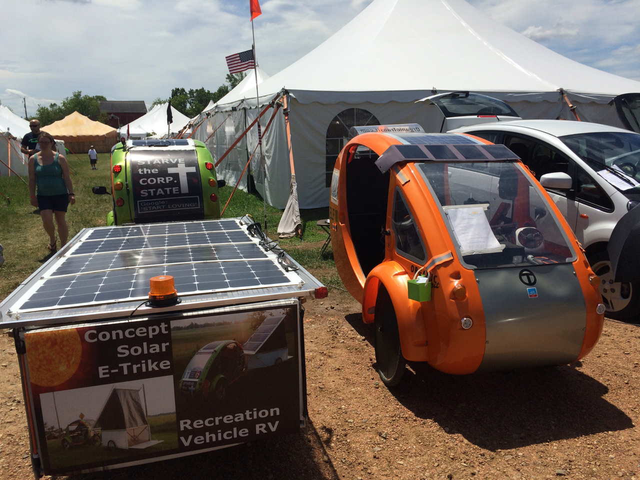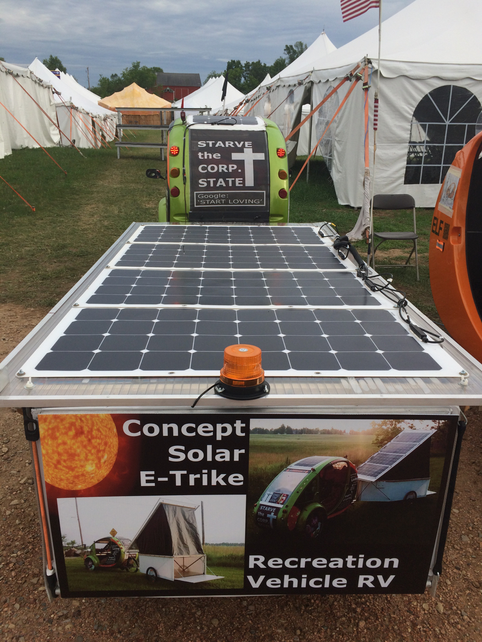 Probably the most interesting person who I met this year is James. He showed up on a three-wheeled electric bicycle called an ELF. He’s modified his quite a bit and it tows a bicycle-sized pop-up trailer, covered with solar panels. During the day, the solar charges the batteries for the electric motor, and at night the lid pops up and he sleeps inside the trailer.