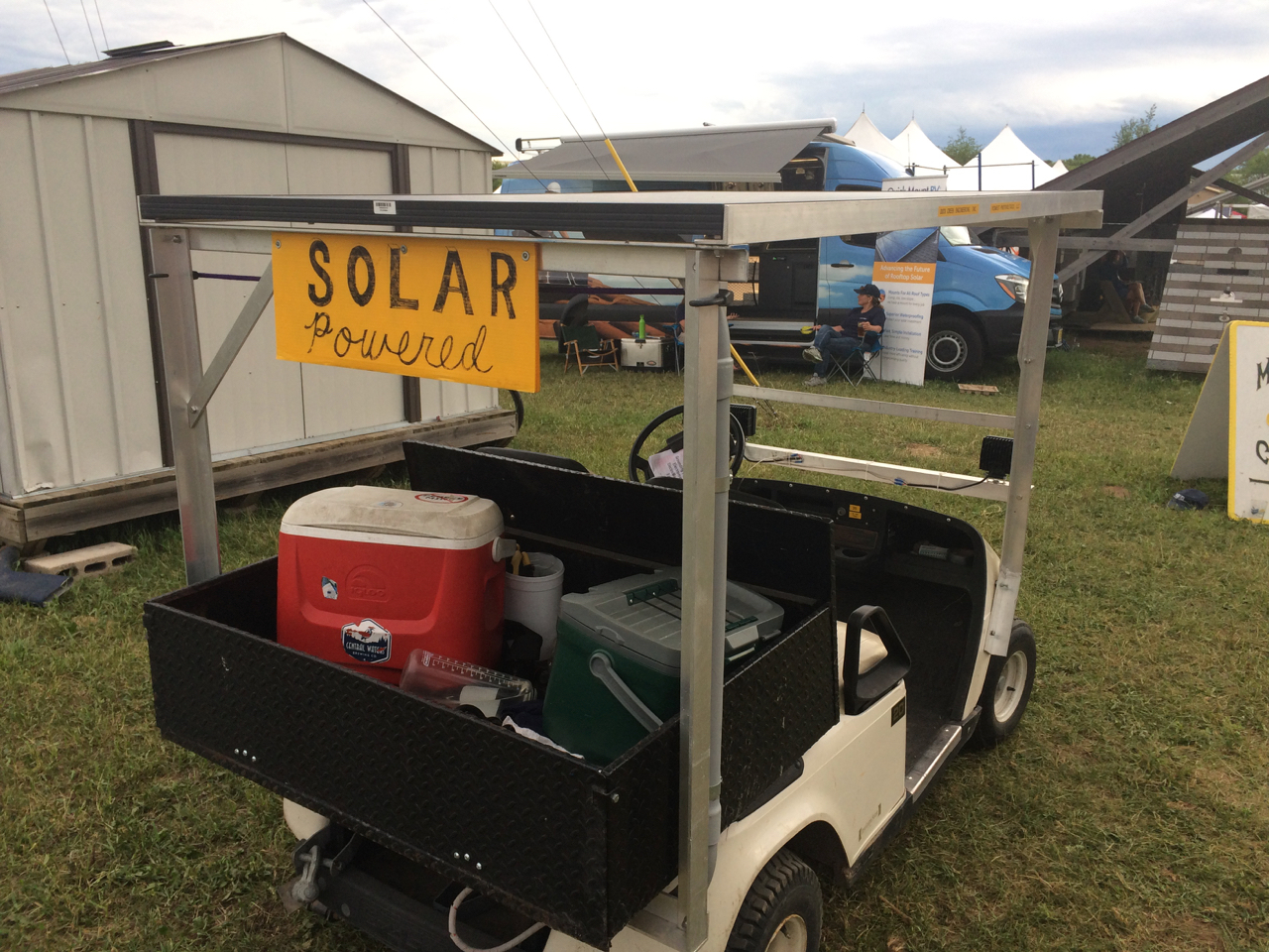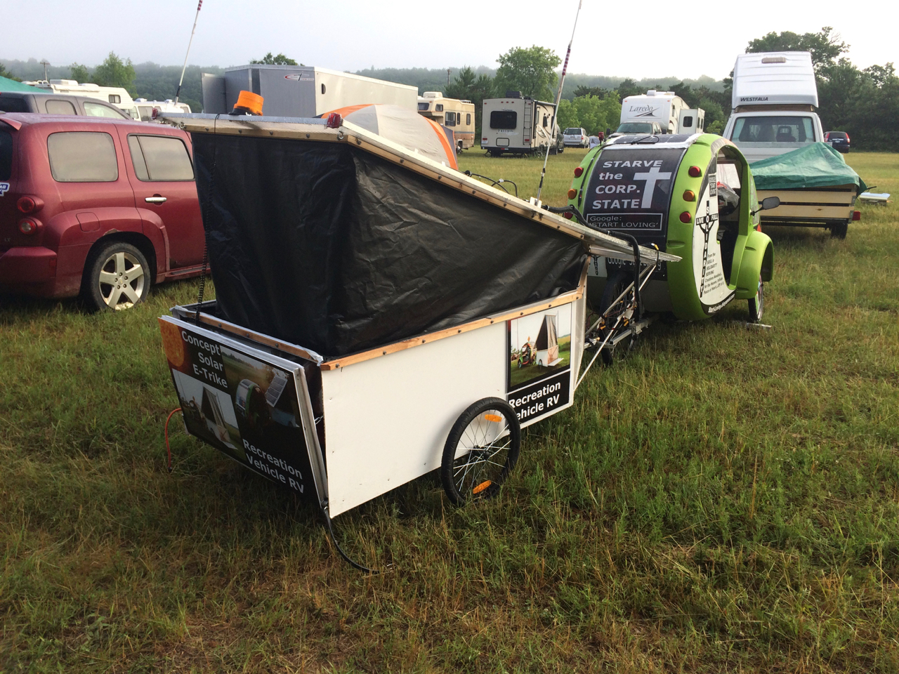 My friend and fellow Solar-Powered Electric Car Driver, Bruce, was at the camp-ground with his home-made camping trailer. “Campy McCampface” is a foam trailer built on a custom aluminum frame, designed for light weight to be towed by an electric car. Bruce gave me a tour and I got to see the details of how he built it. With this being one of his first trips out, Bruce also let me know of a few improvements he already had in mind.