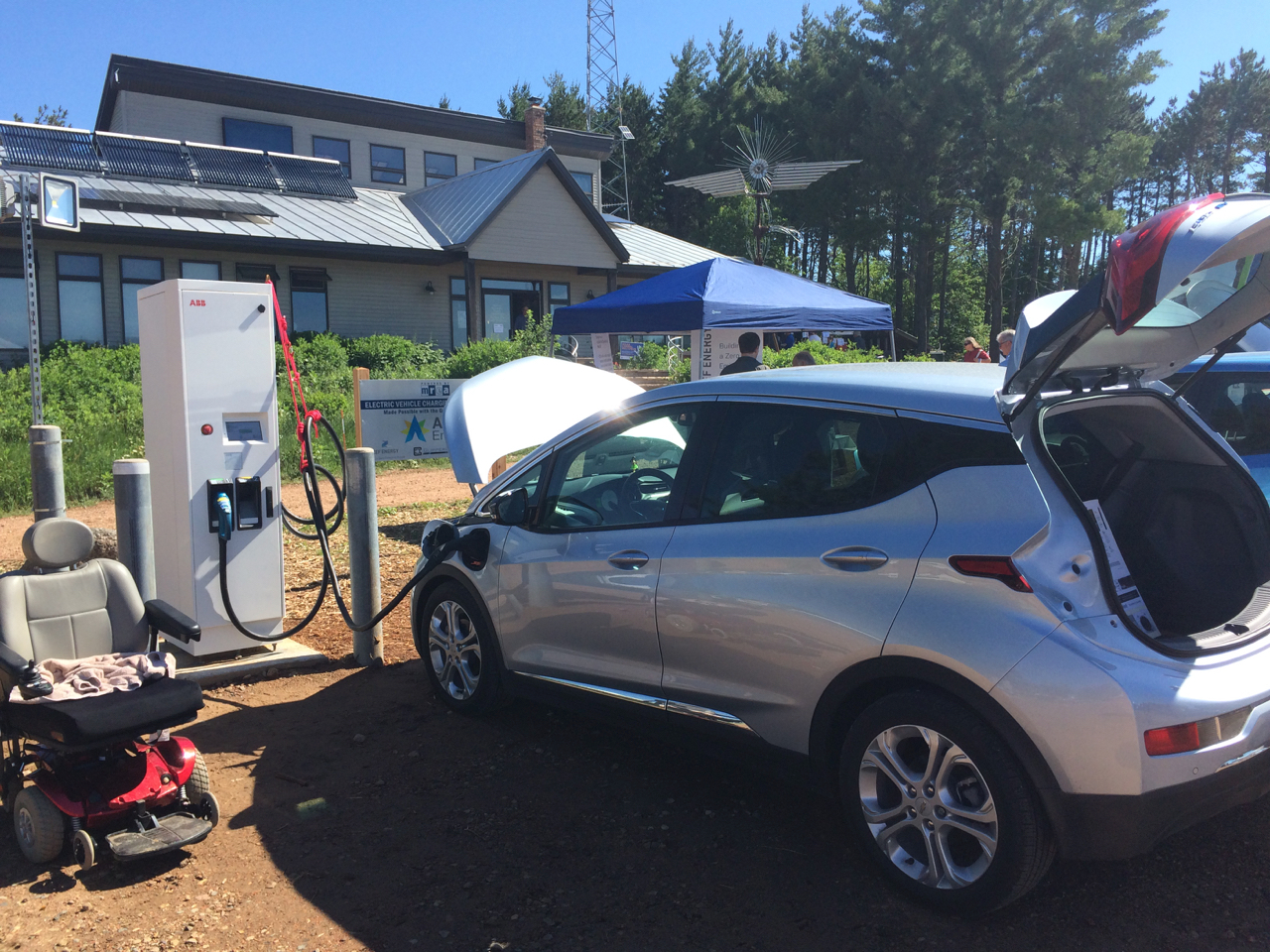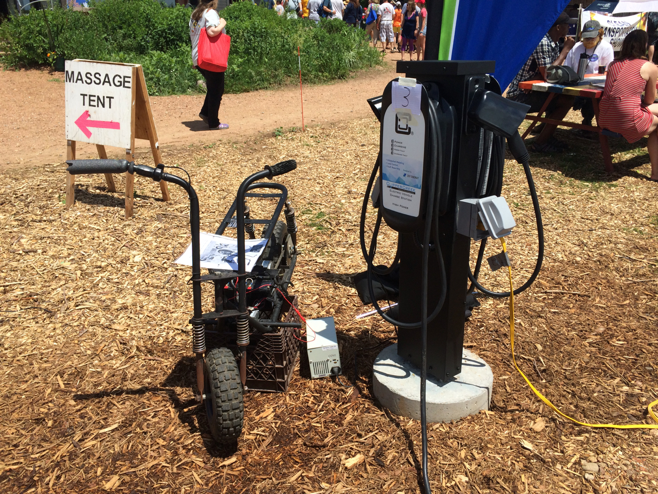 I headed up to the Energy Fair this past Thursday with my G.E. Elec-Trak in tow on a trailer. I showed off the tractor and an electric mini-bike conversion in the clean transportation car show. One thing that made me feel more like a part of the event than ever before was that I was there the previous weekend, installing electric vehicle charging stations. I also made it up in time for the kickoff Thursday evening dinner, which included a moving memorial to energy pioneer and HOME POWER publisher, Richard Perez.