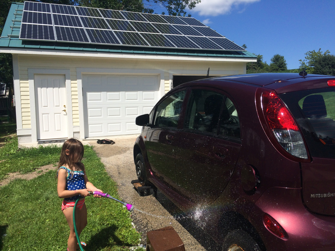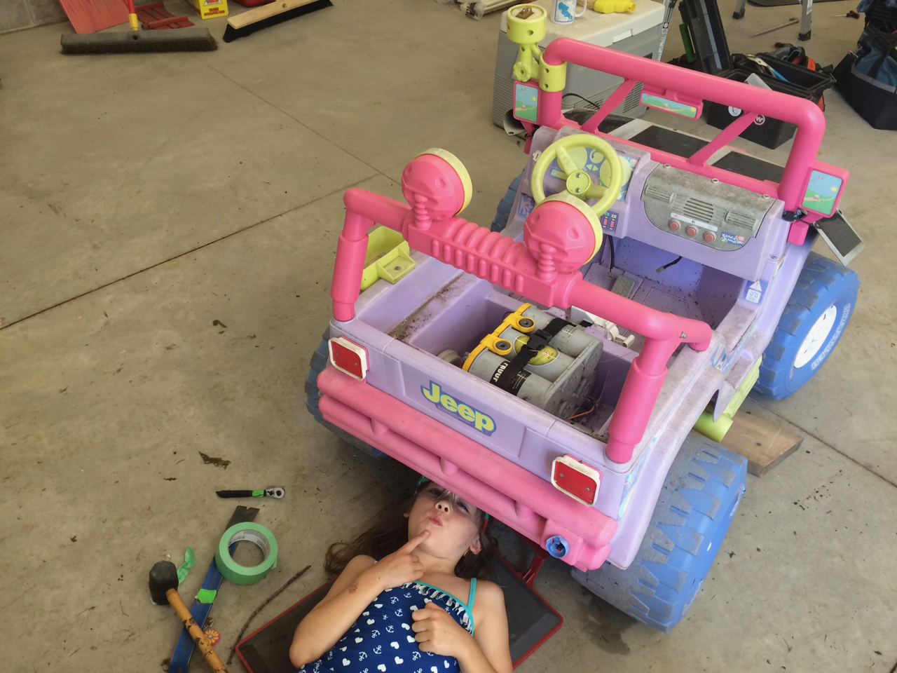 The day before, I cleaned out the inside of the car, which had become defacto storage space. The Little Girl also gave me a hand washing it. After the quick car wash, it was looking brand new again, and was sort of making me regret losing the car, but I haven’t been making use of it, and I’d love to get the space back in my driveway. I did a little bit more work on the car, such as reinstalling the fender plastic liners. While I was doing that, the Little Girl decided that she would also be an electric car mechanic and set to work on her Solar PowerWheels Jeep. (We are now in Generation 2 of the Solar Power Wheels. See how we built the original one HERE.)