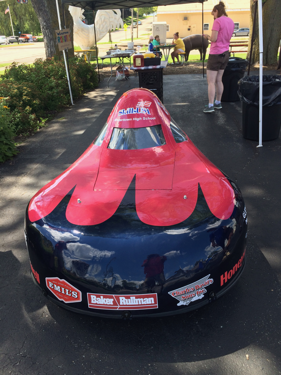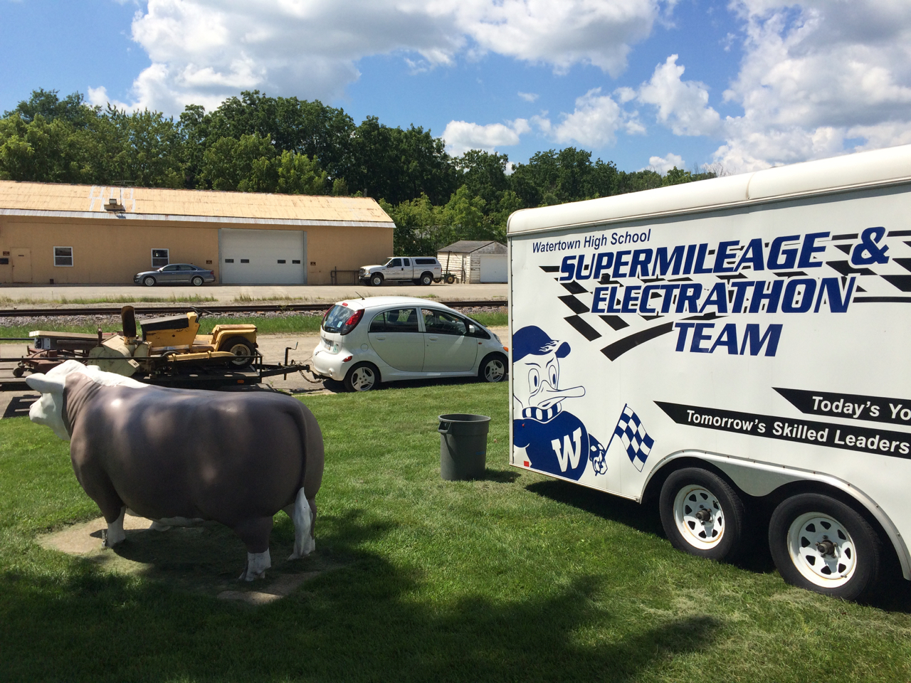 On my way back, I saw some electric cars that I recognized. The Watertown High School Electrathon team was holding a fund-raiser, selling bratwurst, at the local meat market. I stopped in to say hello to the instructor, Jesse, and see what the students were up to. A few years ago, leant a hand to the team by doing some consulting and loaning out some equipment to the team. The students showed me their latest car, a fully-enclosed fiberglassed three-wheeler, which looked fantastic. The students also had some great comments and questions on instrumentation and telemetry about their project. In return, I showed them my electric car and the electric tractor and equipment up on the trailer.