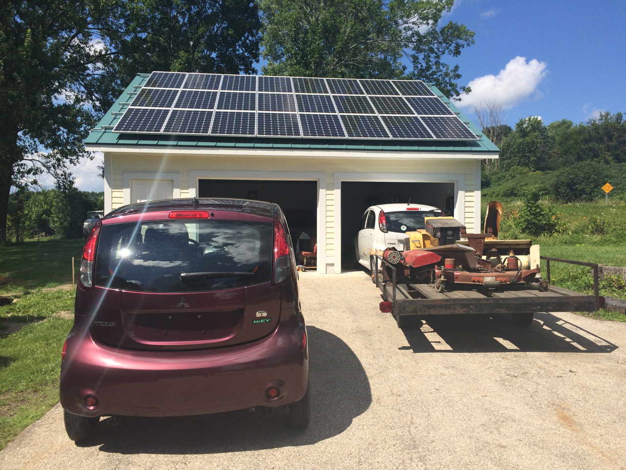 So, there you have it. Just a typical weekend of electric cars at my house; Transporting Electric Tractors, meeting High School Electric Car Builders, loading disabled parts cars onto trailers, smashing my car, and solar-powering Teslas!