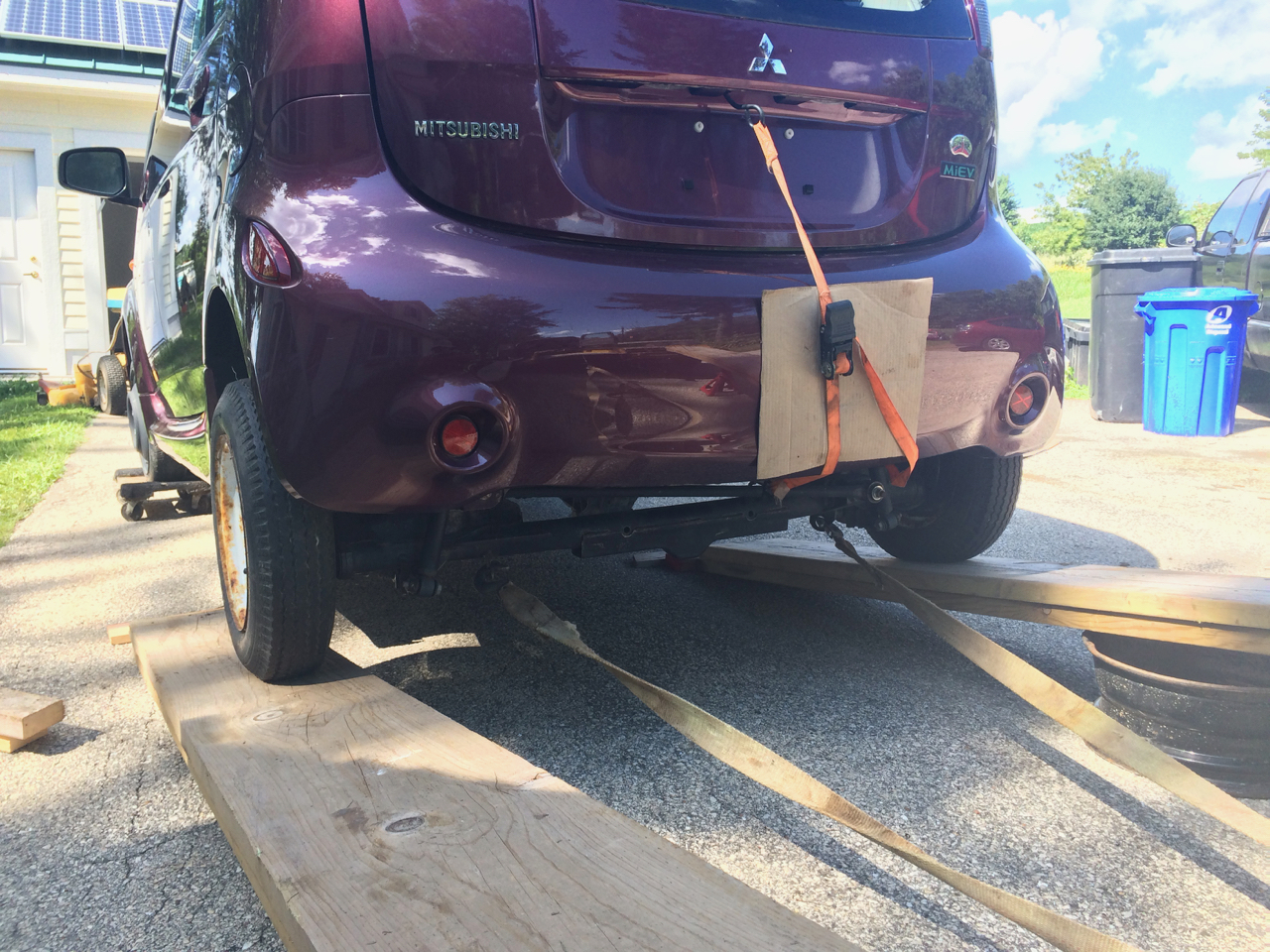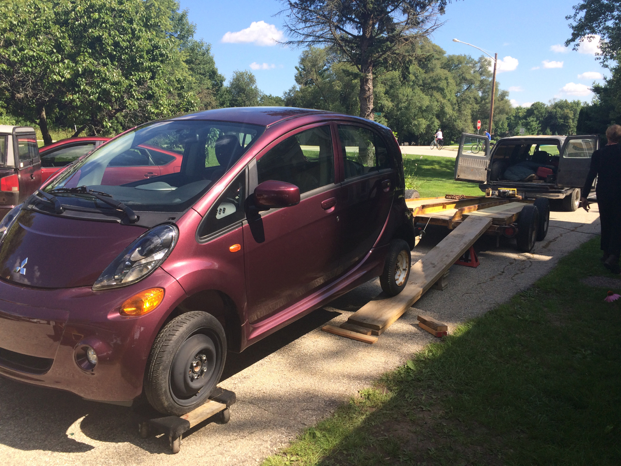 When Pdon showed up, we lined up some heavy wood planks to his trailer. The iMiEV unfortunately can NOT steer. I was able to bust loose the ignition, but the steering still felt locked; perhaps because the electric power steering wasn’t powered up? Ahead of time, I had already put the front wheels of the car on a pair of furniture dollies, which allowed me to move the car’s steering end. The car was also in neutral, but still difficult to roll. I think that the drum brakes in the back are probably rusted up. I was able to move the car, but only by pulling it with a tow strap attached to my electric tractor.